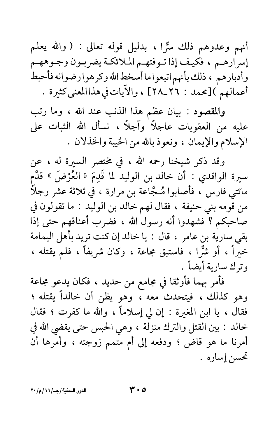 والمقصود: بيان عظم هذا الذنب عند الله، وما رتب عليه من العقوبات عاجلا وآجلا؛ نسأل الله الثبات على الإسلام والإيمان، ونعوذ بالله من الخيبة والخذلان. وقد ذكر شيخنا رحمه الله، في مختصر السيرة له، عن سيرة الواقدي: "أن خالد بن الوليد لما قَدِمَ "العُرْضَ" قدَّم مائتي فارس، فأصابوا مُجَّاعة بن مرارة، في ثلاثة عشر رجلا من قومه بني حنيفة، فقال لهم خالد بن الوليد: ما تقولون في صاحبكم؟ فشهدوا أنه رسول الله، فضرب أعناقهم حتى إذا بقي سارية بن عامر، قال: يا خالد إن كنت تريد بأهل اليمامة خيرا أو شرا، فاستبق مجاعة، وكان شريفا، فلم يقتله، وترك سارية أيضا.