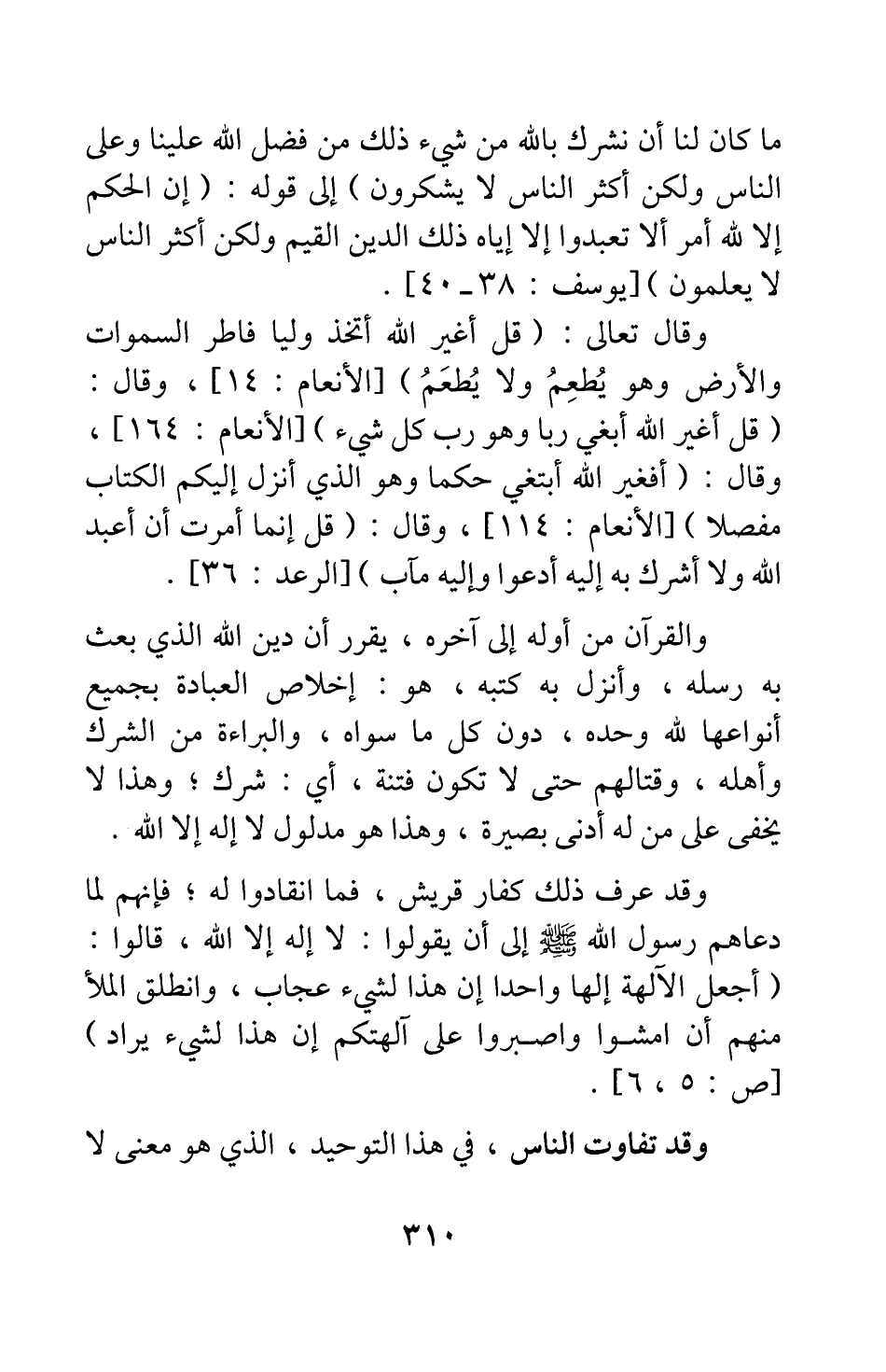 مَا كَانَ لَنَا أَنْ نُشْرِكَ بِاللَّهِ مِنْ شَيْءٍ ذَلِكَ مِنْ فَضْلِ اللَّهِ عَلَيْنَا وَعَلَى النَّاسِ وَلَكِنَّ أَكْثَرَ النَّاسِ لا يَشْكُرُونَ} [سورة يوسف آية: 38] إلى قوله: {إِنِ الْحُكْمُ إِلَّا لِلَّهِ أَمَرَ أَلَّا تَعْبُدُوا إِلَّا إِيَّاهُ ذَلِكَ الدِّينُ الْقَيِّمُ وَلَكِنَّ أَكْثَرَ النَّاسِ لا يَعْلَمُونَ} [سورة يوسف آية: 40] ، وقال تعالى: {قُلْ أَغَيْرَ اللَّهِ أَتَّخِذُ وَلِيّاً فَاطِرِ السَّمَاوَاتِ وَالْأَرْضِ وَهُوَ يُطْعِمُ وَلا يُطْعَمُ} [سورة الأنعام آية: 14] ، وقال: {قُلْ أَغَيْرَ اللَّهِ أَبْغِي رَبّاً وَهُوَ رَبُّ كُلِّ شَيْءٍ} [سورة الأنعام آية: 164] ، وقال: {أَفَغَيْرَ اللَّهِ أَبْتَغِي حَكَماً وَهُوَ الَّذِي أَنْزَلَ إِلَيْكُمُ الْكِتَابَ مُفَصَّلاً} [سورة الأنعام آية: 114] ، وقال: {قُلْ إِنَّمَا أُمِرْتُ أَنْ أَعْبُدَ لااللَّهَ وَلا أُشْرِكَ بِهِ إِلَيْهِ أَدْعُو وَإِلَيْهِ مَآبِ} [سورة الرعد آية: 36] . والقرآن من أوله إلى آخره، يقرر أن دين الله الذي بعث به رسله، وأنزل به كتبه، هو: إخلاص العبادة بجميع أنواعها لله وحده، دون كل ما سواه، والبراءة من الشرك وأهله، وقتالهم حتى لا تكون فتنة، أي: شرك; وهذا لا يخفى على من له أدنى بصيرة؛ وهذا هو مدلول لا إله إلا الله.