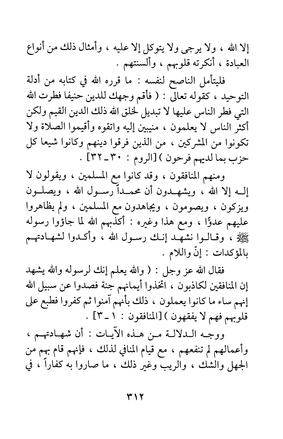 فليتأمل الناصح لنفسه ما قرره الله في كتابه من أدلة التوحيد، كقوله تعالى: {فَأَقِمْ وَجْهَكَ لِلدِّينِ حَنِيفاً فِطْرَتَ اللَّهِ الَّتِي فَطَرَ النَّاسَ عَلَيْهَا لا تَبْدِيلَ لِخَلْقِ اللَّهِ ذَلِكَ الدِّينُ الْقَيِّمُ وَلَكِنَّ أَكْثَرَ النَّاسِ لا يَعْلَمُونَ مُنِيبِينَ إِلَيْهِ وَاتَّقُوهُ وَأَقِيمُوا الصَّلاةَ وَلا تَكُونُوا مِنَ الْمُشْرِكِينَ مِنَ الَّذِينَ فَرَّقُوا دِينَهُمْ وَكَانُوا شِيَعاً كُلُّ حِزْبٍ بِمَا لَدَيْهِمْ فَرِحُونَ} [سورة الزوم آية: 30-31-32] . ومنهم المنافقون، وقد كانوا مع المسلمين، ويقولون لا إله إلا الله، ويشهدون أن محمدا رسول الله، ويصلون ويزكون، ويصومون، ويجاهدون مع المسلمين، ولم يظاهروا عليهم عدوا؛ ومع هذا وغيره، أكذبهم الله لما جاءوا رسوله صلى الله عليه وسلم وقالوا: نشهد إنك رسول الله، وأكدوا لشهادتهم بالمؤكدات: إنّ واللام، فقال الله عز وجل: {وَاللَّهُ يَعْلَمُ إِنَّكَ لَرَسُولُهُ وَاللَّهُ يَشْهَدُ إِنَّ الْمُنَافِقِينَ لَكَاذِبُونَ اتَّخَذُوا أَيْمَانَهُمْ جُنَّةً فَصَدُّوا عَنْ سَبِيلِ اللَّهِ إِنَّهُمْ سَاءَ مَا كَانُوا يَعْمَلُونَ ذَلِكَ بِأَنَّهُمْ آمَنُوا ثُمَّ كَفَرُوا فَطُبِعَ عَلَى قُلُوبِهِمْ فَهُمْ لا يَفْقَهُونَ} [سورة المنافقون آية: 1-2-3] . ووجه الدلالة من هذه الآيات: أن شهادتهم وأعمالهم لم تنفعهم، مع قيام المنافي لذلك< فإنهم قام بهم من الجهل والشك، والريب وغير ذلك، ما صاروا به كفارا في