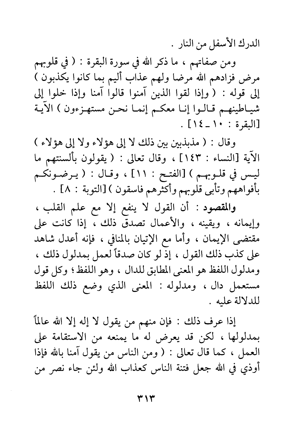 والمقصود: أن القول لا ينفع إلا مع علم القلب، وإيمانه، ويقينه؛ والأعمال تصدق ذلك إذا كانت على مقتضى الإيمان، وأما مع الإتيان بالمنافي، فإنه أعدل شاهد على كذب ذلك القول؛ إذ لو كان صدقا لعمل بمدلول ذلك. ومدلول اللفظ هو المعنى المطابق للدال، وهو اللفظ; وكل قول مستعمل دال، ومدلوله: المعنى الذي وضع ذلك اللفظ للدلالة عليه.