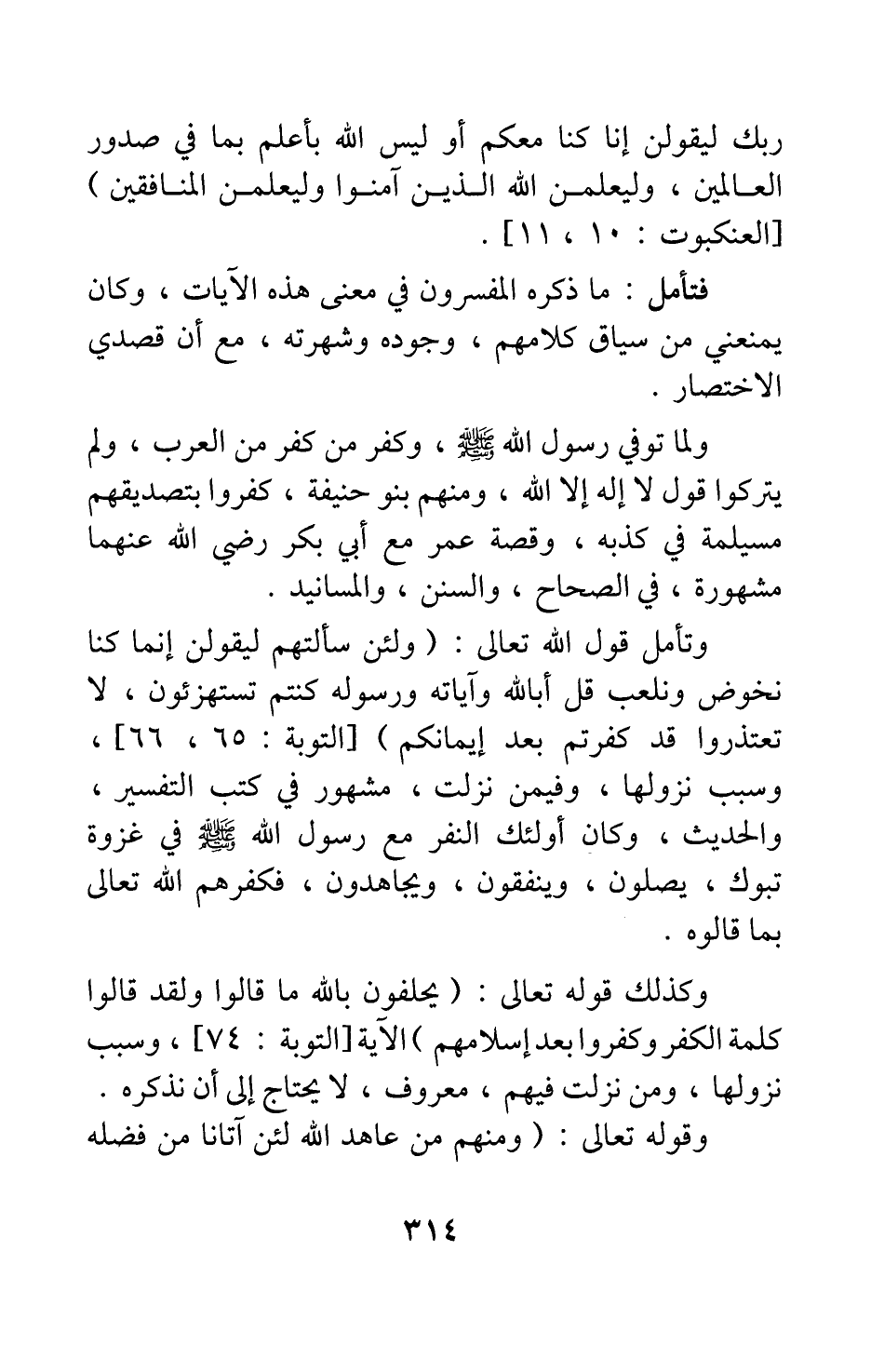 وتأمل قول الله تعالى: {وَلَئِنْ سَأَلْتَهُمْ لَيَقُولُنَّ إِنَّمَا كُنَّا نَخُوضُ وَنَلْعَبُ قُلْ أَبِاللَّهِ وَآيَاتِهِ وَرَسُولِهِ كُنْتُمْ تَسْتَهْزِئُونَ?لا تَعْتَذِرُوا قَدْ كَفَرْتُمْ بَعْدَ إِيمَانِكُمْ} [سورة التوبة آية: 65-66] ؛ وسبب نزولها، وفيمن نزلت، مشهور في كتب التفسير والحديث. وكان أولئك النفر مع رسول الله صلى الله عليه وسلم في غزوة تبوك، يصلون، وينفقون، ويجاهدون، فكفرهم الله تعالى بما قالوه. وكذلك قوله تعالى: {يَحْلِفُونَ بِاللَّهِ مَا قَالُوا وَلَقَدْ قَالُوا كَلِمَةَ الْكُفْرِ وَكَفَرُوا بَعْدَ إِسْلامِهِمْ} [سورة التوبة آية: 74] الآية، وسبب نزولها، ومن نزلت فيهم، معروف، لا يحتاج إلى أن نذكره.
