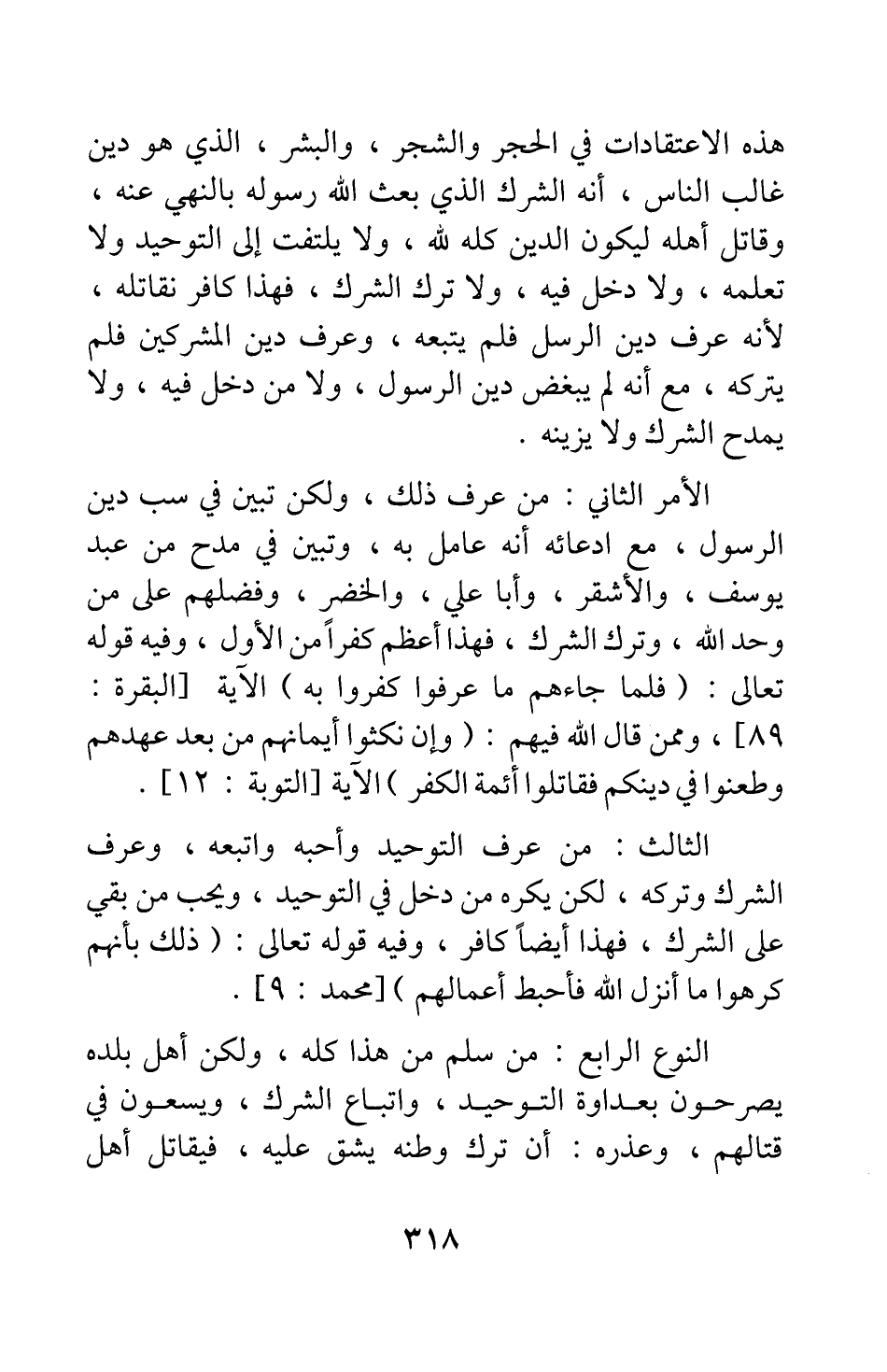 الثالث: من عرف التوحيد وأحبه واتبعه، وعرف الشرك وتركه؛ لكن يكره من دخل في التوحيد، ويحب من بقي على الشرك؛ فهذا أيضا كافر، وفيه قوله تعالى: {ذَلِكَ بِأَنَّهُمْ كَرِهُوا مَا أَنْزَلَ اللَّهُ فَأَحْبَطَ أَعْمَالَهُمْ} [سورة محمد آية: 9] .
