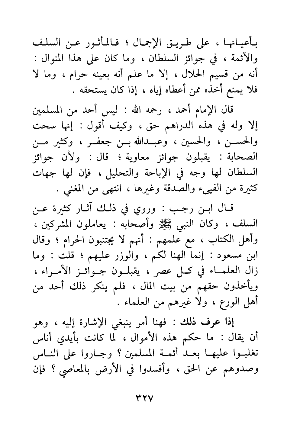 قال ابن رجب: وروي في ذلك آثار كثيرة عن السلف، وكان النبي صلى الله عليه وسلم وأصحابه: يعاملون المشركين، وأهل الكتاب، مع علمهم أنهم لا يجتنبون الحرام; وقال ابن مسعود: إنما الهنا لكم، والوزر عليهم. قلت: وما زال العلماء في كل عصر، يقبلون جوائز الأمراء، ويأخذون حقهم من بيت المال، فلم ينكر ذلك أحد من أهل الورع، ولا غيرهم من العلماء.