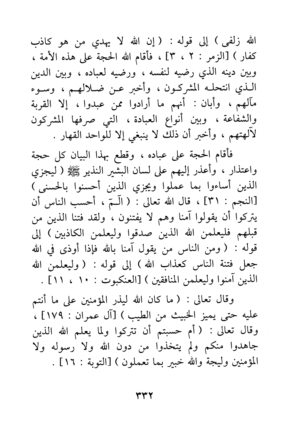 إلى قوله: {إِنَّ اللَّهَ لا يَهْدِي مَنْ هُوَ كَاذِبٌ كَفَّارٌ} [سورة الزمر آية: 3] ؛ فأقام الله الحجة على هذه الأمه، وبين دينه الذي رضيه لنفسه، ورضيه لعباده، وبين الدين الذي انتحله المشركون، وأخبر عن ضلالهم، وسوء مآلهم، وأبان أنهم ما أرادوا ممن عبدوا، إلا القربة والشفاعة، وبين أنواع العبادة، التي صرفها المشركون لآلهتهم، وأخبر أن ذلك لا ينبغي إلا للواحد القهار.