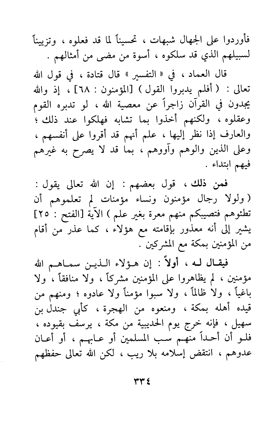 قال العماد، في "التفسير": قال قتادة، في قول الله تعالى: {أَفَلَمْ يَدَّبَّرُوا الْقَوْلَ} [سورة المؤمنون آية: 68] : إذ والله يجدون في القرآن زاجرا عن معصية الله، لو تدبره القوم وعقلوه، ولكنهم أخذوا بما تشابه فهلكوا عند ذلك؛ والعارف إذا نظر إليها، علم أنهم قد أقروا على أنفسهم، وعلى الذين والَوْهم وآووهم، بما قد لا يصرح به غيرهم فيهم ابتداء.