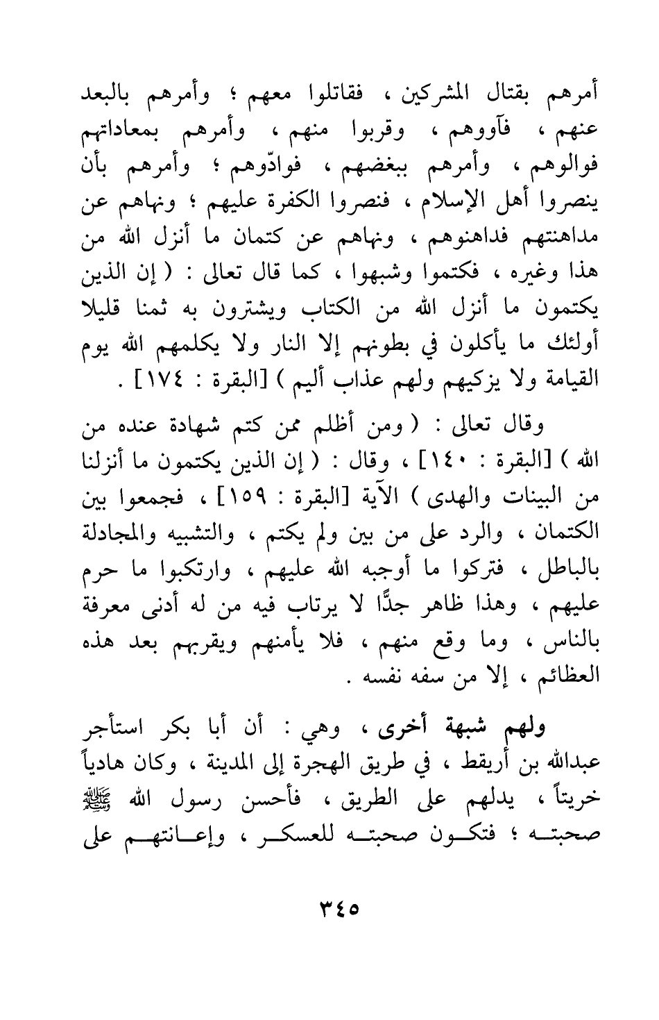 وقال تعالى: {وَمَنْ أَظْلَمُ مِمَّنْ كَتَمَ شَهَادَةً عِنْدَهُ مِنَ اللَّهِ} [سورة البقرة آية: 140] ، وقال: {إِنَّ الَّذِينَ يَكْتُمُونَ مَا أَنْزَلْنَا مِنَ الْبَيِّنَاتِ وَالْهُدَى} [سورة البقرة آية: 159] الآية، فجمعوا بين الكتمان والرد على من بين ولم يكتم، والتشبيه والمجادلة بالباطل، فتركوا ما أوجبه الله عليهم، وارتكبوا ما حرم عليهم؛ وهذا ظاهر جدا لا يرتاب فيه من له أدنى معرفة بالناس؛ وما وقع منهم، فلا يأمنهم ويقربهم بعد هذه العظائم، إلا من سفه نفسه.