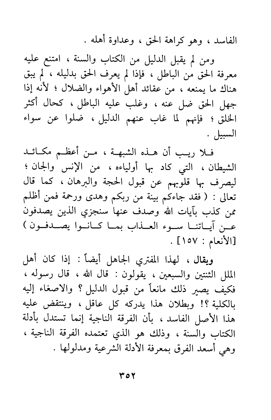 ومن لم يقبل الدليل من الكتاب والسنة، امتنع عليه معرفة الحق من الباطل؛ فإذا لم يعرف الحق بدليله، لم يبق هناك ما يمنعه من عقائد أهل الأهواء والضلال; لأنه إذا جهل الحق ضل عنه، وغلب عليه الباطل، كحال أكثر الخلق; فإنهم لما غاب عنهم الدليل، ضلوا عن سواء السبيل.