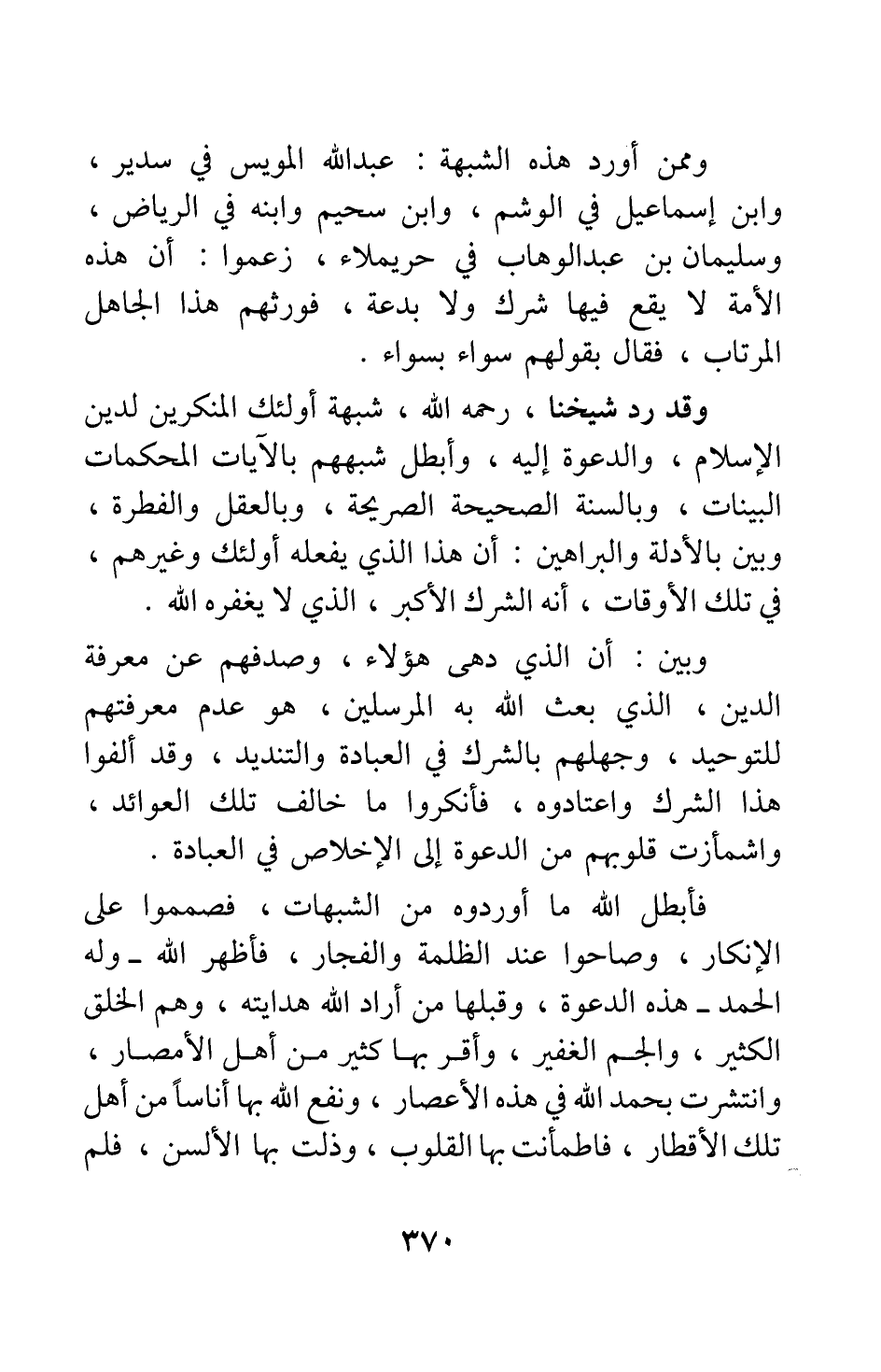 وقد رد شيخنا، رحمه الله، شبهة أولئك المنكرين لدين الإسلام والدعوة إليه، وأبطل شبههم بالآيات المحكمات البينات، وبالسنة الصحيحة الصريحة، وبالعقل والفطرة، وبين بالأدلة والبراهين أن هذا الذي يفعله أولئك وغيرهم، في تلك الأوقات، أنه الشرك الأكبر الذي لا يغفره الله.