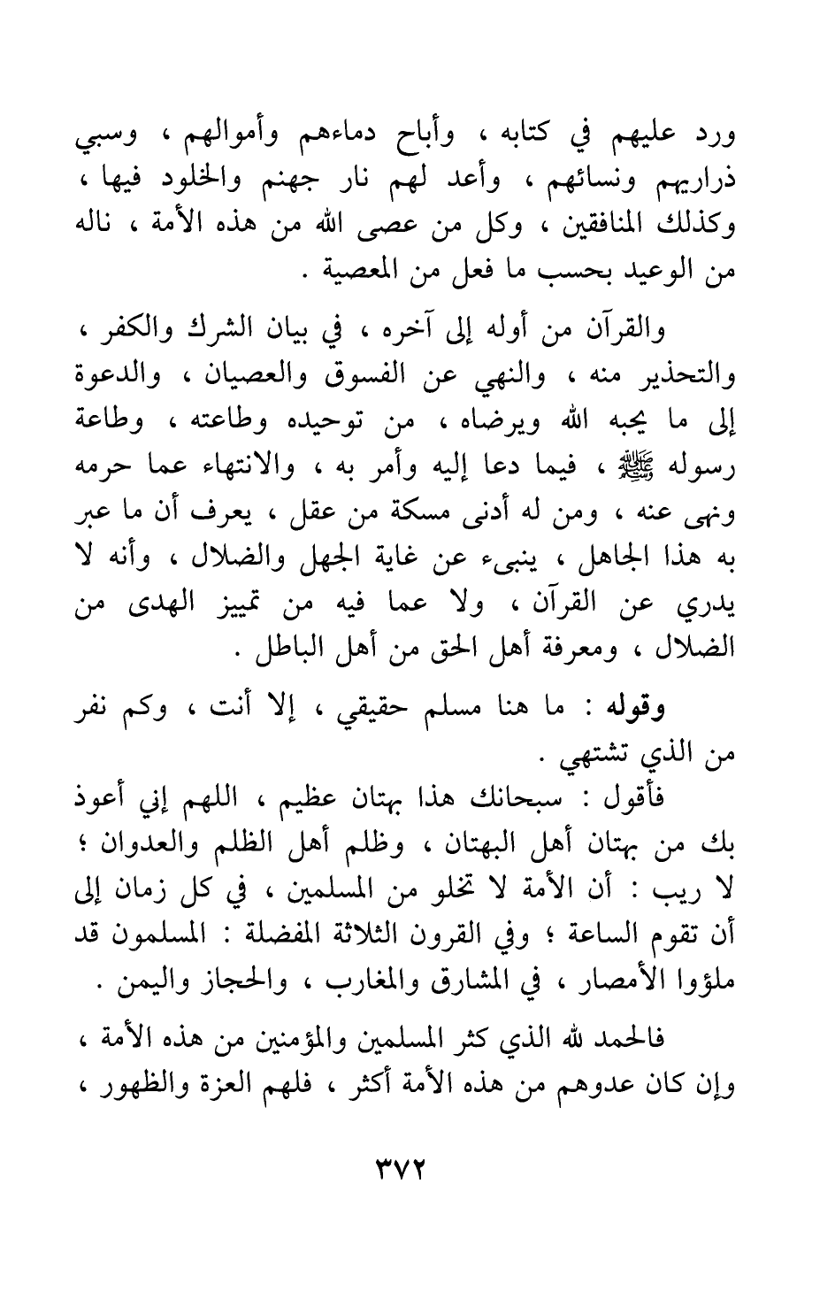 فأقول: سبحانك هذا بهتان عظيم! اللهم إني أعوذ بك من بهتان أهل البهتان، وظلم أهل الظلم والعدوان; لا ريب أن الأمة لا تخلو من المسلمين، في كل زمان إلى أن تقوم الساعة; وفي القرون الثلاثة المفضلة، المسلمون قد ملؤوا الأمصار، في المشارق والمغارب، والحجاز واليمن.
