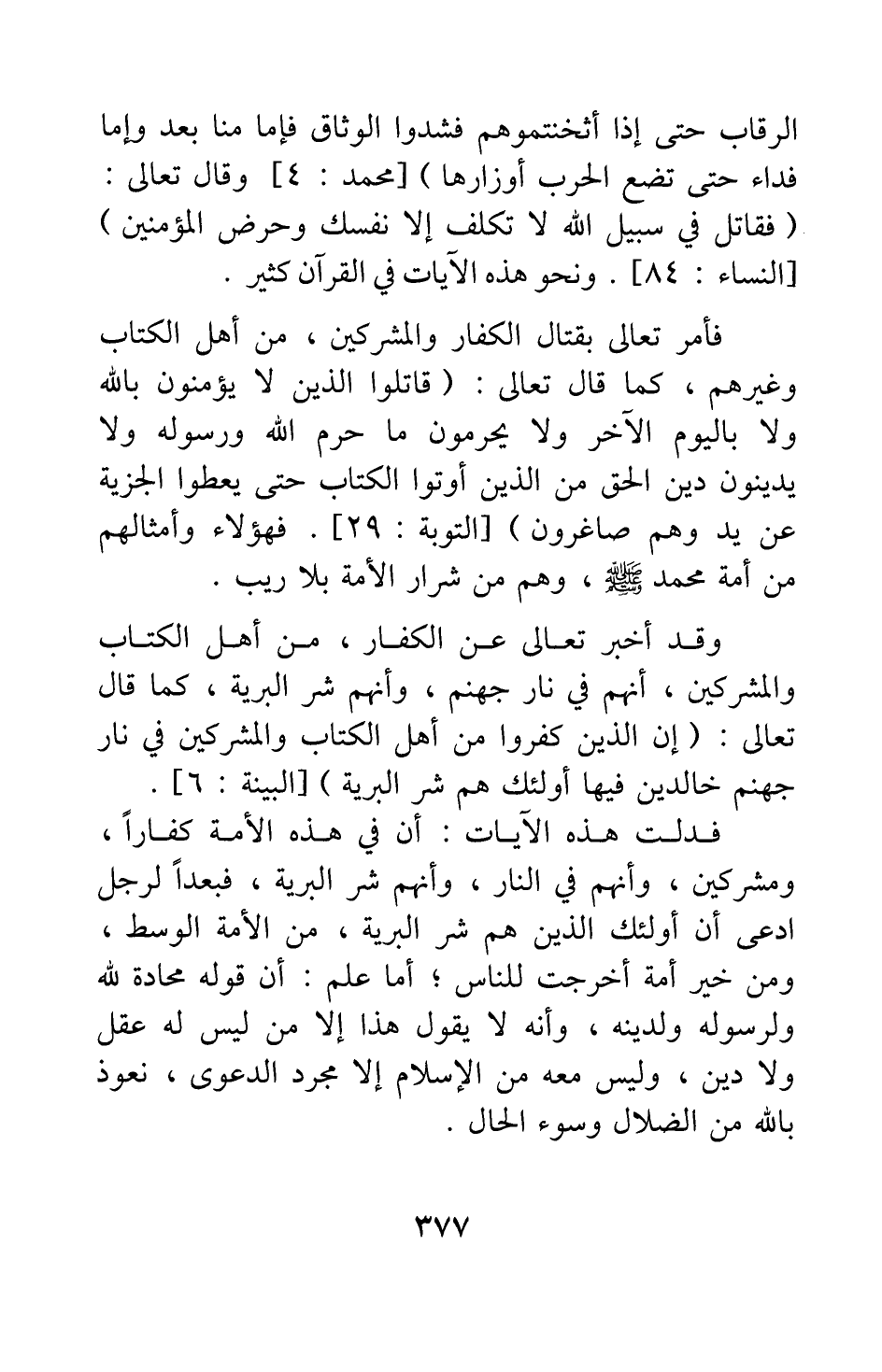 فأمر تعالى بقتال الكفار والمشركين، من أهل الكتاب وغيرهم، كما قال تعالى: قَاتِلُوا الَّذِينَ لا يُؤْمِنُونَ بِاللَّهِ وَلا بِالْيَوْمِ الْآخِرِ وَلا يُحَرِّمُونَ مَا حَرَّمَ اللَّهُ وَرَسُولُهُ وَلا يَدِينُونَ دِينَ الْحَقِّ مِنَ الَّذِينَ أُوتُوا الْكِتَابَ حَتَّى يُعْطُوا الْجِزْيَةَ عَنْ يَدٍ وَهُمْ صَاغِرُونَ} [سورة التوبة آية: 29] ؛ فهؤلاء وأمثالهم من أمة محمد صلى الله عليه وسلم وهم من شرار الأمة بلا ريب.