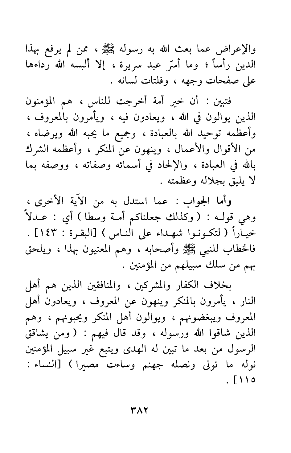 فتبين أن خير أمة أخرجت للناس هم المؤمنون الذين يوالون في الله، ويعادون فيه، ويأمرون بالمعروف، وأعظمه توحيد الله بالعبادة، وجميع ما يحبه الله ويرضاه، من الأقوال والأعمال، وينهون عن المنكر، وأعظمه الشرك بالله في العبادة، والإلحاد في أسمائه وصفاته، ووصفه بما لا يليق بجلاله وعظمته.