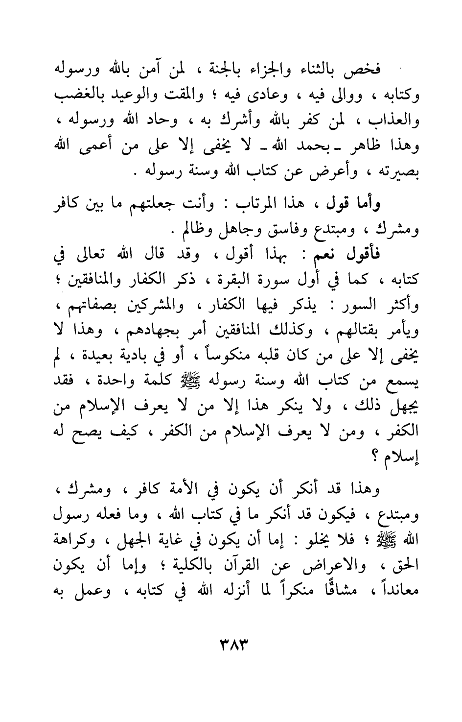 وهذا قد أنكر أن يكون في الأمة كافر، ومشرك، ومبتدع، فيكون قد أنكر ما في كتاب الله، وما فعله رسول الله صلى الله عليه وسلم. فلا يخلو إما أن يكون في غاية الجهل، وكراهة الحق، والإعراض عن القرآن بالكلية، وإما أن يكون معاندا، مشاقا منكرا لما أنزله الله في كتابه، وعمل به