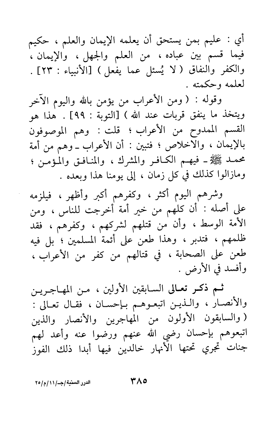 وقوله: {وَمِنَ الْأَعْرَابِ مَنْ يُؤْمِنُ بِاللَّهِ وَالْيَوْمِ الْآخِرِ وَيَتَّخِذُ مَا يُنْفِقُ قُرُبَاتٍ عِنْدَ اللَّهِ} [سورة التوبة آية: 99] ، هذا هو القسم الممدوح من الأعراب. قلت: وهم الموصوفون بالإيمان، والإخلاص; فتبين: أن الأعراب - وهم من أمة محمد صلى الله عليه وسلم - فيهم الكافر والمشرك، والمنافق والمؤمن; وما زالوا كذلك في كل زمان، إلى يومنا هذا وبعده.