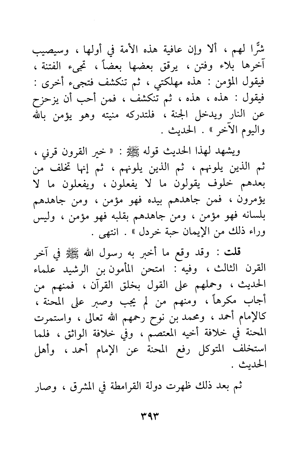 قلت: وقد وقع ما أخبر به رسول الله صلى الله عليه وسلم في آخر القرن الثالث، وفيه: امتحن المأمون بن الرشيد علماء الحديث، وحملهم على القول بخلق القرآن. فمنهم من أجاب مكرها، ومنهم من لم يجب وصبر على المحنة، كالإمام أحمد، ومحمد بن نوح رحمهم الله تعالى، واستمرت المحنة في خلافة أخيه المعتصم، وفي خلافة الواثق. فلما استخلف المتوكل رفع المحنة عن الإمام أحمد، وأهل الحديث.