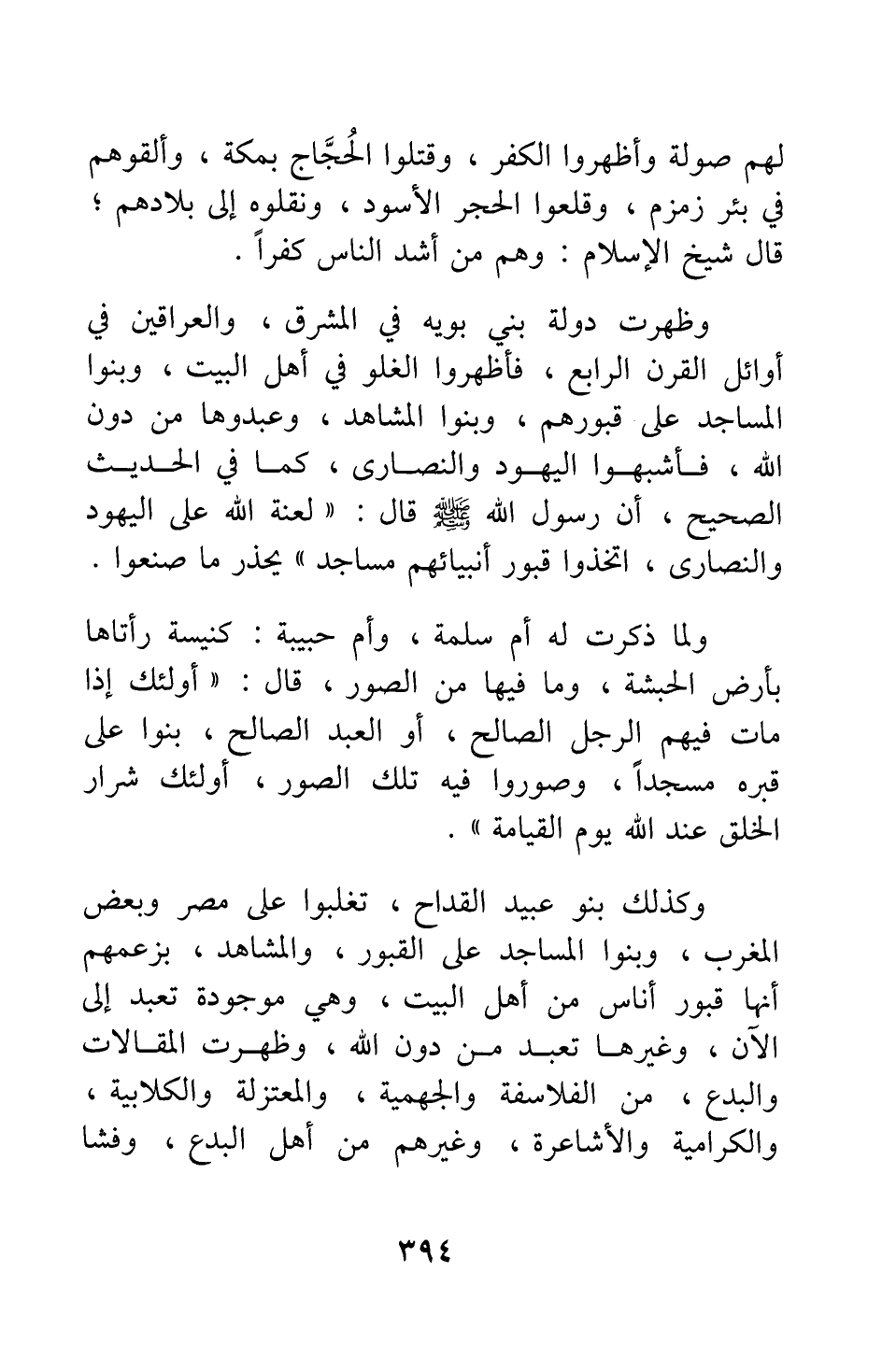 وظهرت دولة بني بويه في المشرق، والعراقين في أوائل القرن الرابع، فأظهروا الغلو في أهل البيت، وبنوا المساجد على قبورهم، وبنوا المشاهد، وعبدوها من دون الله، فأشبهوا اليهود والنصارى، كما في الحديث الصحيح، أن رسول الله صلى الله عليه وسلم قال: " لعنة الله على اليهود والنصارى، اتخذوا قبور أنبيائهم مساجد " 1، يحذر ما صنعوا.