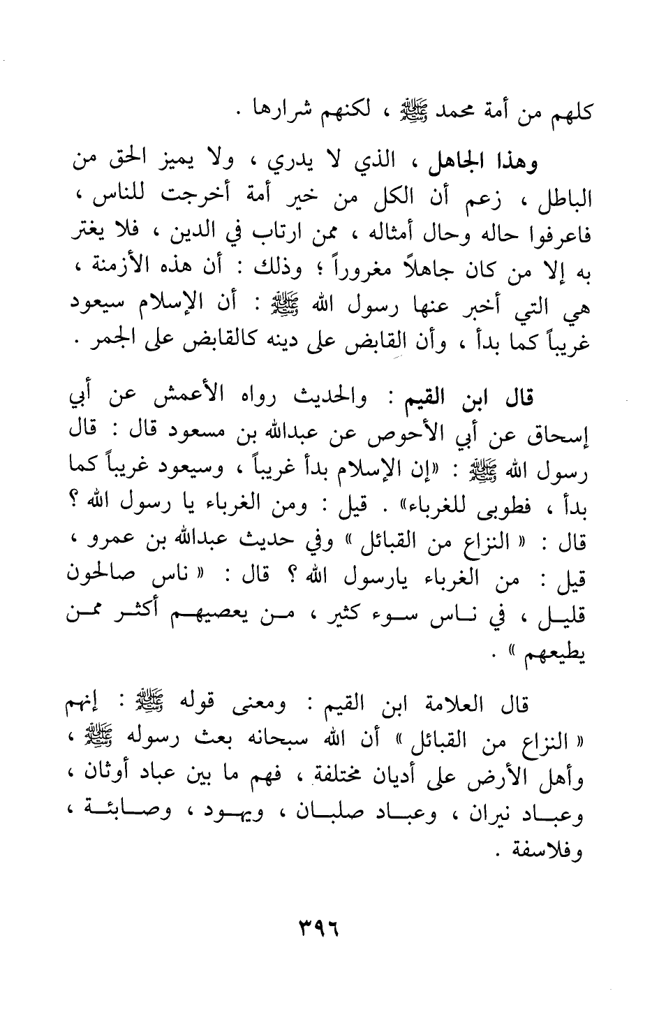 قال ابن القيم: والحديث رواه الأعمش عن أبي إسحاق عن أبي الأحوص عن عبد الله بن مسعود قال: قال رسول الله صلى الله عليه وسلم " إن الإسلام بدأ غريبا، وسيعود غريبا كما بدأ؛ فطوبى للغرباء. قيل: ومن الغرباء يا رسول الله؟ قال: النّزّاع من القبائل ". وفي حديث عبد الله بن عمرو: " قيل: من الغرباء يا رسول الله؟ قال: ناس صالحون قليل، في ناس سوء كثير، من يعصيهم أكثر ممن يطيعهم " 1.
