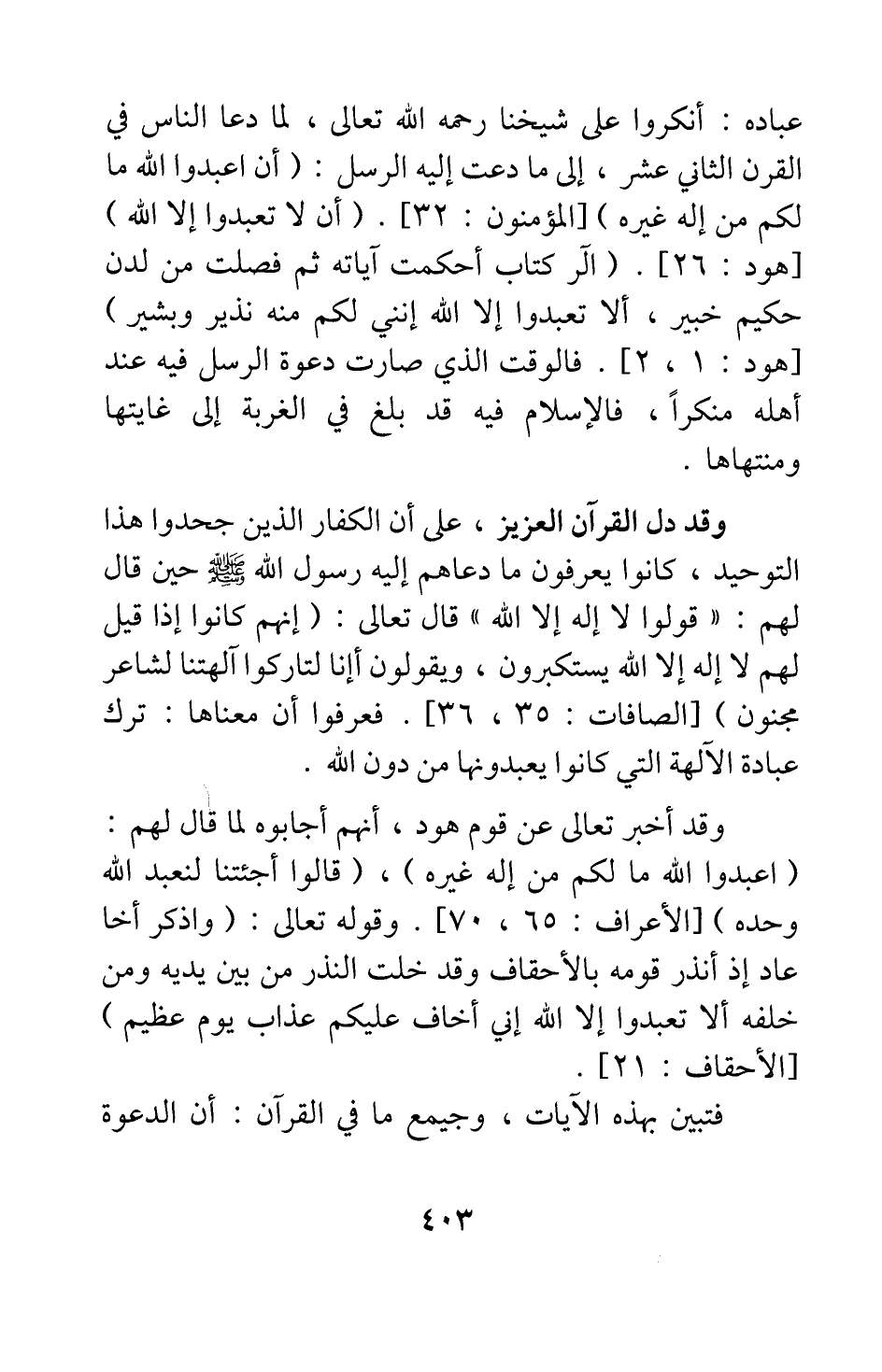 عباده أنكروا على شيخنا رحمه الله تعالى، لما دعا الناس في القرن الثاني عشر، إلى ما دعت إليه الرسل: {أَنِ اعْبُدُوا اللَّهَ مَا لَكُمْ مِنْ إِلَهٍ غَيْرُهُ} [سورة المؤمنون آية: 32] {أَنْ لا تَعْبُدُوا إِلَّا اللَّهَ} [سورة هود آية: 26] ، {الر كِتَابٌ أُحْكِمَتْ آيَاتُهُ ثُمَّ فُصِّلَتْ مِنْ لَدُنْ حَكِيمٍ خَبِيرٍأَلَّا تَعْبُدُوا إِلَّا اللَّهَ إِنَّنِي لَكُمْ مِنْهُ نَذِيرٌ وَبَشِيرٌ} [سورة هود آية: 1-2-3] . فالوقت الذي صارت دعوة الرسل فيه عند أهله منكرا، فالإسلام فيه قد بلغ في الغربة إلى غايتها ومنتهاها.