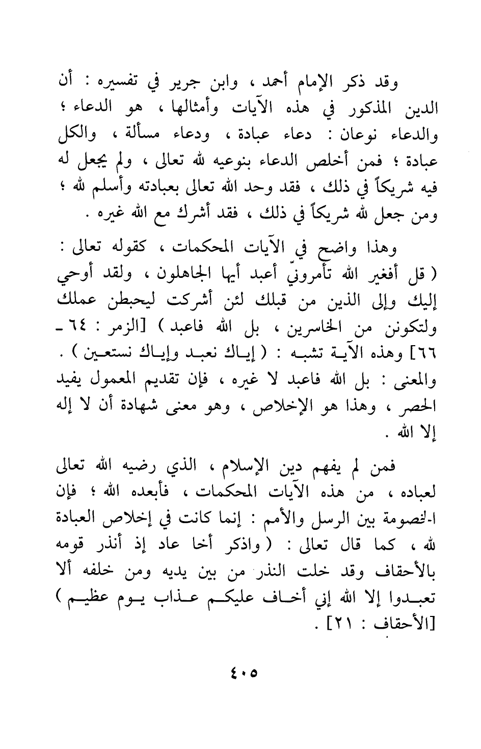 وهذا واضح في الآيات المحكمات، كقوله تعالى: {قُلْ أَفَغَيْرَ اللَّهِ تَأْمُرُونِّي أَعْبُدُ أَيُّهَا الْجَاهِلُونَ وَلَقَدْ أُوحِيَ إِلَيْكَ وَإِلَى الَّذِينَ مِنْ قَبْلِكَ لَئِنْ أَشْرَكْتَ لَيَحْبَطَنَّ عَمَلُكَ وَلَتَكُونَنَّ مِنَ الْخَاسِرِينَ بَلِ اللَّهَ فَاعْبُدْ} [سورة الزمر آية: 64-65-66] ؛ وهذه الآية تشبه: {إِيَّاكَ نَعْبُدُ وَإِيَّاكَ نَسْتَعِينُ} [سورة الفاتحة آية: 5] ، والمعنى: بل الله فاعبد لا غيره؛ فإن تقديم المعمول يفيد الحصر، وهذا هو الإخلاص، وهو معنى شهادة أن لا إله إلا الله.