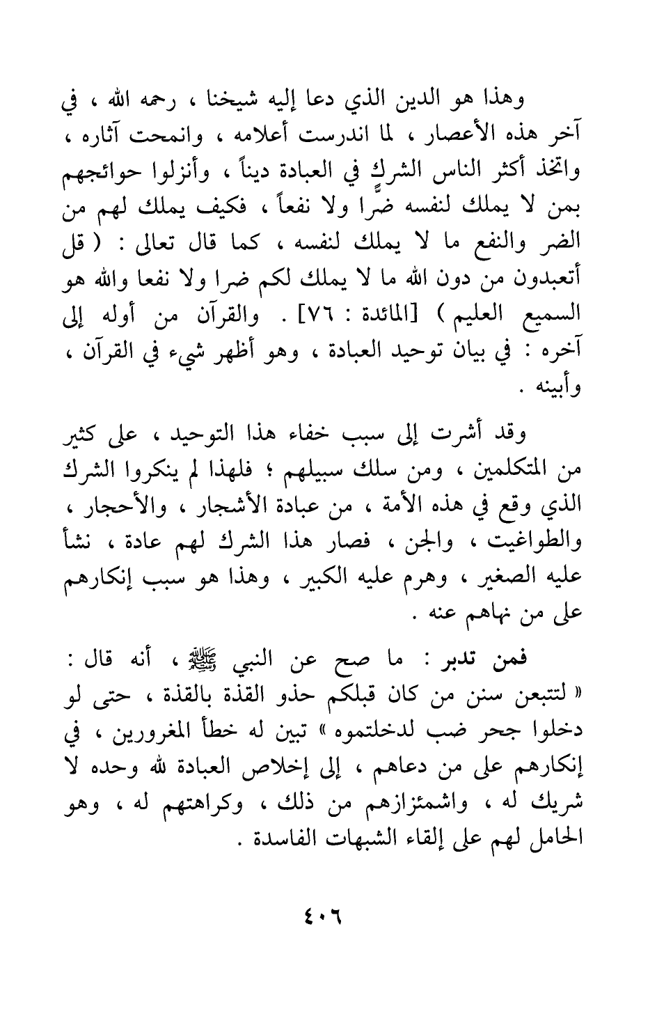 وهذا هو الدين الذي دعا إليه شيخنا، رحمه الله، في آخر هذه الأعصار، لما اندرست أعلامه، وانمحت آثاره، واتخذ أكثر الناس الشرك في العبادة دينا، وأنزلوا حوائجهم بمن لا يملك لنفسه ضرا ولا نفعا؛ فكيف يملك لهم من الضر والنفع ما لا يملك لنفسه، كما قال تعالى: {فَلِلَّهِ الْحَمْدُ رَبِّ السَّمَاوَاتِ وَرَبِّ الْأَرْضِ رَبِّ الْعَالَمِينَ} [سورة المائدة آية: 76] ؟ والقرآن من أوله إلى آخره في بيان توحيد العبادة، وهو أظهر شيء في القرآن، وأبينه.