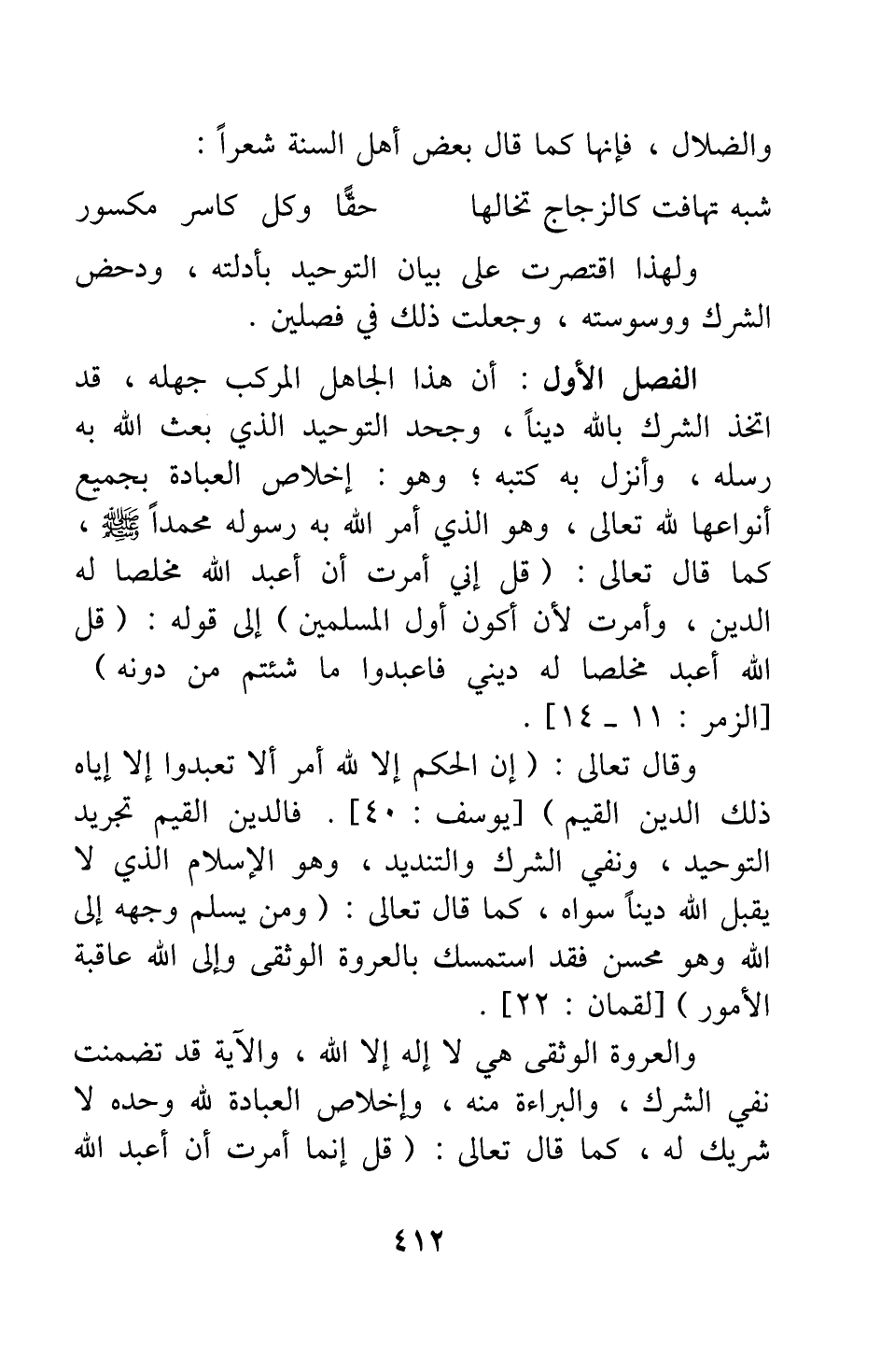 ولهذا اقتصرت على بيان التوحيد بأدلته، ودحض الشرك ووسوسته، وجعلت ذلك في فصلين.