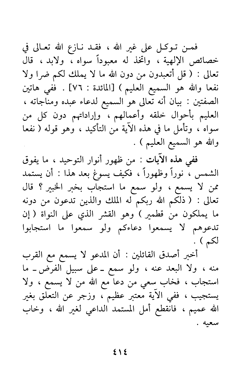 فمن توكل على غير الله، فقد نازع الله تعالى في خصائص الإلهية، واتخذ له معبودا سواه، ولا بد، قال تعالى: {قُلْ أَتَعْبُدُونَ مِنْ دُونِ اللَّهِ مَا لا يَمْلِكُ لَكُمْ ضَرّاً وَلا نَفْعاً وَاللَّهُ هُوَ السَّمِيعُ الْعَلِيمُ} [سورة المائدة آية: 76] ؛ ففي هاتين الصفتين بيان أنه تعالى هو السميع لدعاء عبده ومناجاته، العليم بأحوال خلقه وأعمالهم وإراداتهم دون كل من سواه. وتأمل ما في هذه الآية من التأكيد، وهو قوله {نَفْعاً وَاللَّهُ هُوَ السَّمِيعُ الْعَلِيمُ} [سورة المائدة آية: 76] ؛ ففي هذه الآيات من ظهور أنوار التوحيد ما يفوق الشمس، نورا وظهورا، فكيف يسوغ بعد هذا أن يستمد ممن لا يسمع، ولو سمع ما استجاب بخبر الخبير؟ قال تعالى: {ذَلِكُمُ اللَّهُ رَبُّكُمْ لَهُ الْمُلْكُ وَالَّذِينَ تَدْعُونَ مِنْ دُونِهِ مَا يَمْلِكُونَ مِنْ قِطْمِيرٍ} [سورة فاطر آية: 13] ، وهو القشر الذي على النواة، {إِنْ تَدْعُوهُمْ لا يَسْمَعُوا دُعَاءَكُمْ وَلَوْ سَمِعُوا مَا اسْتَجَابُوا لَكُمْ} [سورة فاطر آية: 14] ؛ أخبر أصدق القائلين أن المدعو لا يسمع مع القرب منه، ولا البعد عنه، ولو سمع- على سبيل الفرض- ما استجاب، فخاب سعي من دعا مع الله من لا يسمع، ولا يستجيب، ففي الآية معتبر عظيم، وزجر عن التعلق بغير الله عميم؛ فانقطع أمل المستمد الداعي لغير الله، وخاب سعيه.