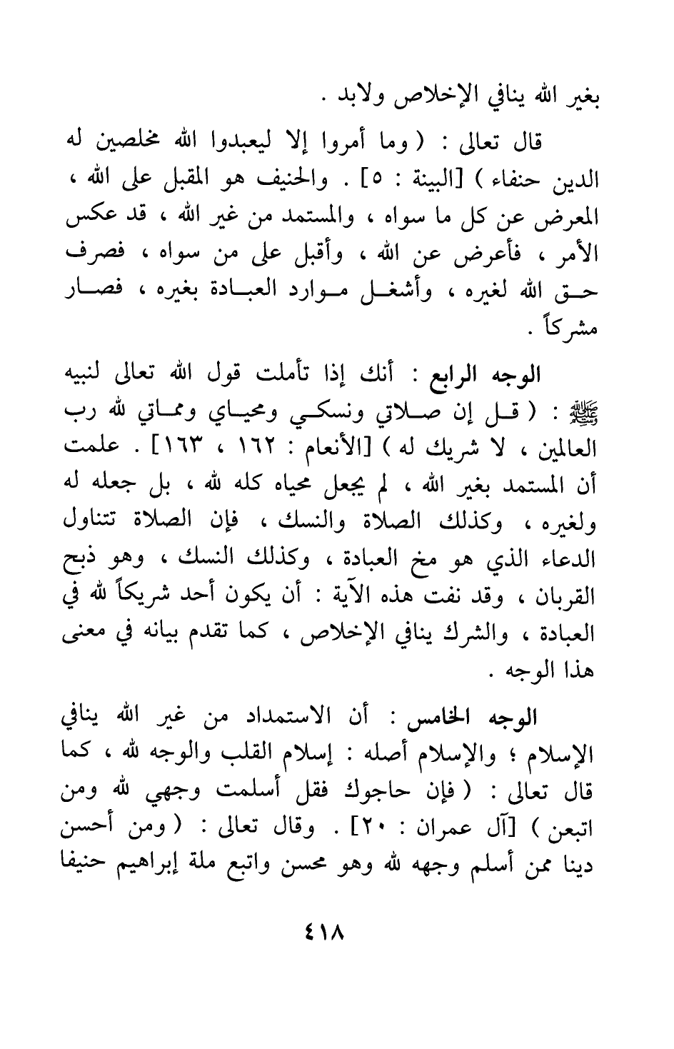 الوجه الرابع: أنك إذا تأملت قول الله تعالى لنبيه صلى الله عليه وسلم {قُلْ إِنَّ صَلاتِي وَنُسُكِي وَمَحْيَايَ وَمَمَاتِي لِلَّهِ رَبِّ الْعَالَمِينَ لا شَرِيكَ لَهُ} [سورة الأنعام آية: 162-163] ، علمت أن المستمد بغير الله، لم يجعل محياه كله لله، بل جعله له ولغيره؛ وكذلك الصلاة والنسك، فإن الصلاة تتناول الدعاء الذي هو مخ العبادة، وكذلك النسك وهو ذبح القربان. وقد نفت هذه الآية أن يكون أحد شريكا لله في العبادة؛ والشرك ينافي الإخلاص، كما تقدم بيانه في معنى هذا الوجه.