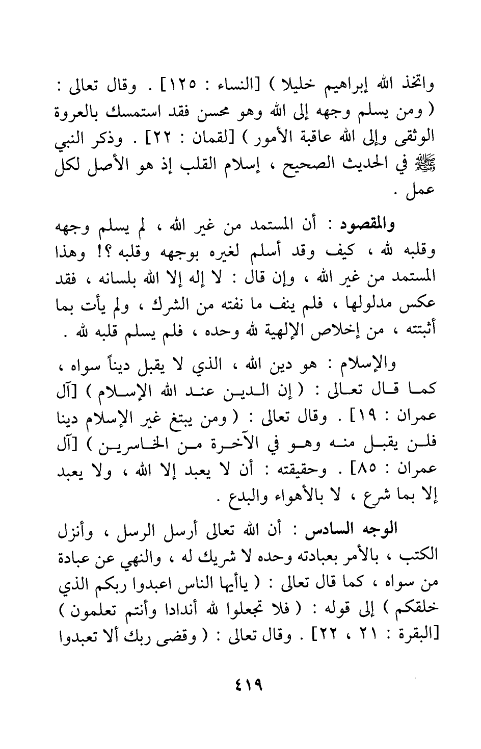 والإسلام: هو دين الله الذي لا يقبل دينا سواه، كما قال تعالى: {إِنَّ الدِّينَ عِنْدَ اللَّهِ الْأِسْلامُ} [سورة آل عمران آية: 19] ، وقال تعالى: {وَمَنْ يَبْتَغِ غَيْرَ الْأِسْلامِ دِيناً فَلَنْ يُقْبَلَ مِنْهُ وَهُوَ فِي الْآخِرَةِ مِنَ الْخَاسِرِينَ} [سورة آل عمران آية: 85] ؛ وحقيقته: أن لا يعبد إلا الله، ولا يعبد إلا بما شرع، لا بالأهواء والبدع.