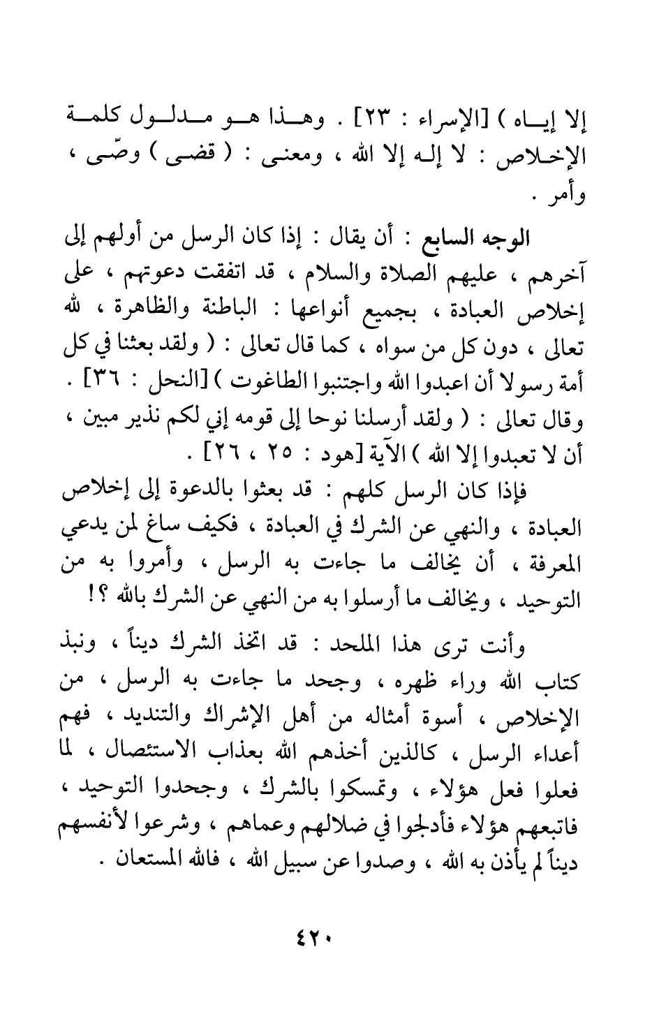 الوجه السابع: أن يقال: إذا كان الرسل من أولهم إلى آخرهم، عليهم الصلاة والسلام، قد اتفقت دعوتهم على إخلاص العبادة بجميع أنواعها الباطنة والظاهرة، لله تعالى دون كل من سواه، كما قال تعالى: {وَلَقَدْ بَعَثْنَا فِي كُلِّ أُمَّةٍ رَسُولاً أَنِ اعْبُدُوا اللَّهَ وَاجْتَنِبُوا الطَّاغُوتَ} [سورة النحل آية: 36] ، وقال تعالى {وَلَقَدْ أَرْسَلْنَا نُوحاً إِلَى قَوْمِهِ إِنِّي لَكُمْ نَذِيرٌ مُبِينٌ أَلَّا تَعْبُدُوا إِلَّا اللَّهَ} [سورة هود آية: 25-26] الآية، فإذا كان الرسل كلهم: قد بعثوا بالدعوة إلى إخلاص العبادة، والنهي عن الشرك في العبادة، فكيف ساغ لمن يدعي المعرفة، أن يخالف ما جاءت به الرسل، وأمروا به من التوحيد، ويخالف ما أرسلوا به من النهي عن الشرك بالله؟ وأنت ترى هذا الملحد قد اتخذ الشرك دينا، ونبذ كتاب الله وراء ظهره، وجحد ما جاءت به الرسل من الإخلاص، أسوة أمثاله من أهل الإشراك والتنديد؛ فهم أعداء الرسل، كالذين أخذهم الله بعذاب الاستئصال، لما فعلوا فعل هؤلاء، وتمسكوا بالشرك، وجحدوا التوحيد، فاتبعهم هؤلاء فأدلجوا في ضلالهم وعماهم، وشرعوا لأنفسهم دينا لم يأذن به الله، وصدوا عن سبيل الله؛ فالله المستعان.