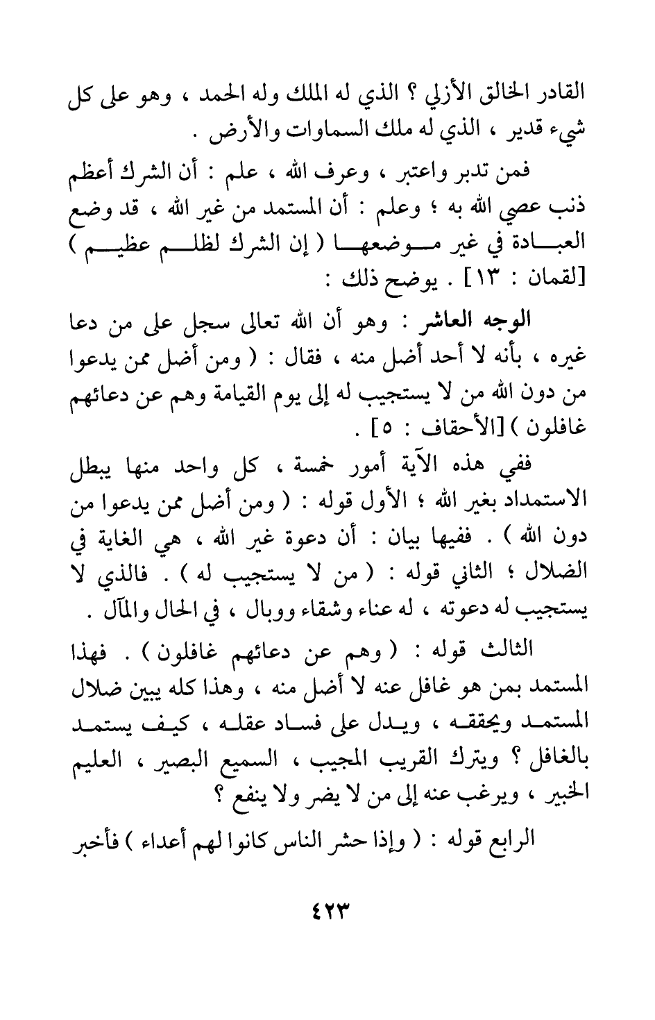 الوجه العاشر: وهو أن الله تعالى سجل على من دعا غيره، بأنه لا أحد أضل منه، فقال: {وَمَنْ أَضَلُّ مِمَّنْ يَدْعُو مِنْ دُونِ اللَّهِ مَنْ لا يَسْتَجِيبُ لَهُ إِلَى يَوْمِ الْقِيَامَةِ وَهُمْ عَنْ دُعَائِهِمْ غَافِلُونَ} [سورة الأحقاف آية: 5] .
