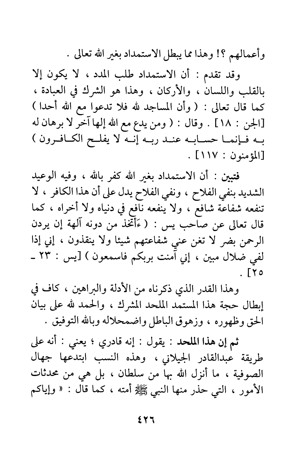 وهذا القدر الذي ذكرناه من الأدلة والبراهين، كاف في إبطال حجة هذا المستمد الملحد المشرك؛ والحمد لله على بيان الحق وظهوره، وزهوق الباطل واضمحلاله، وبالله التوفيق.