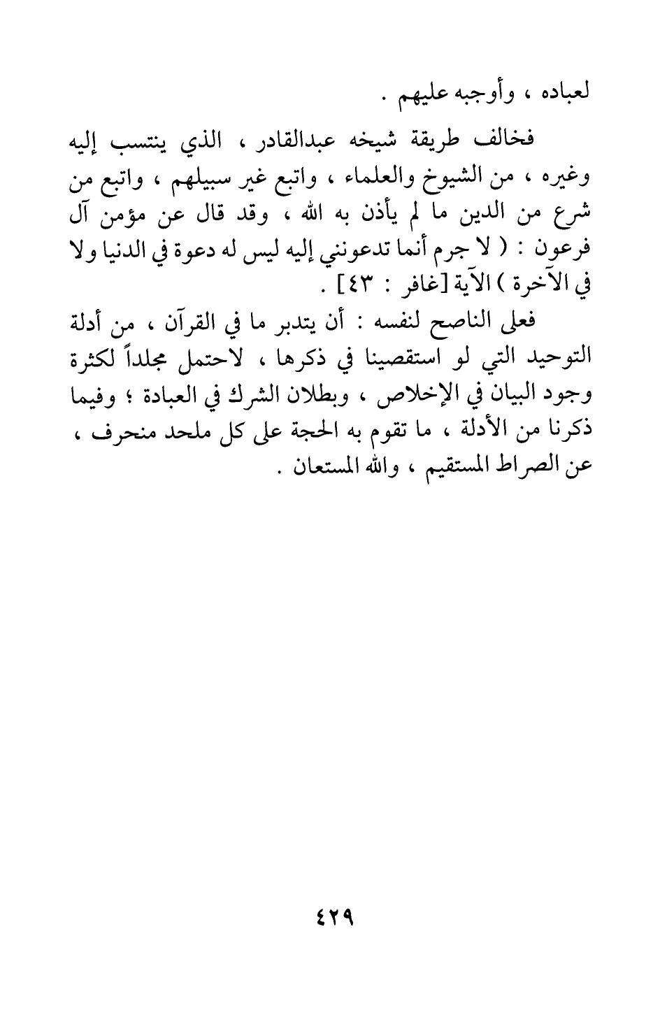 فخالف طريقة شيخه عبد القادر، الذي ينتسب، إليه وغيره من الشيوخ والعلماء، واتبع غير سبيلهم، واتبع من شرع من الدين ما لم يأذن به الله، وقد قال عن مؤمن آل فرعون: {لا جَرَمَ أَنَّمَا تَدْعُونَنِي إِلَيْهِ لَيْسَ لَهُ دَعْوَةٌ فِي الدُّنْيَا وَلا فِي الْآخِرَةِ} [سورة غافر آية: 43] الآية.