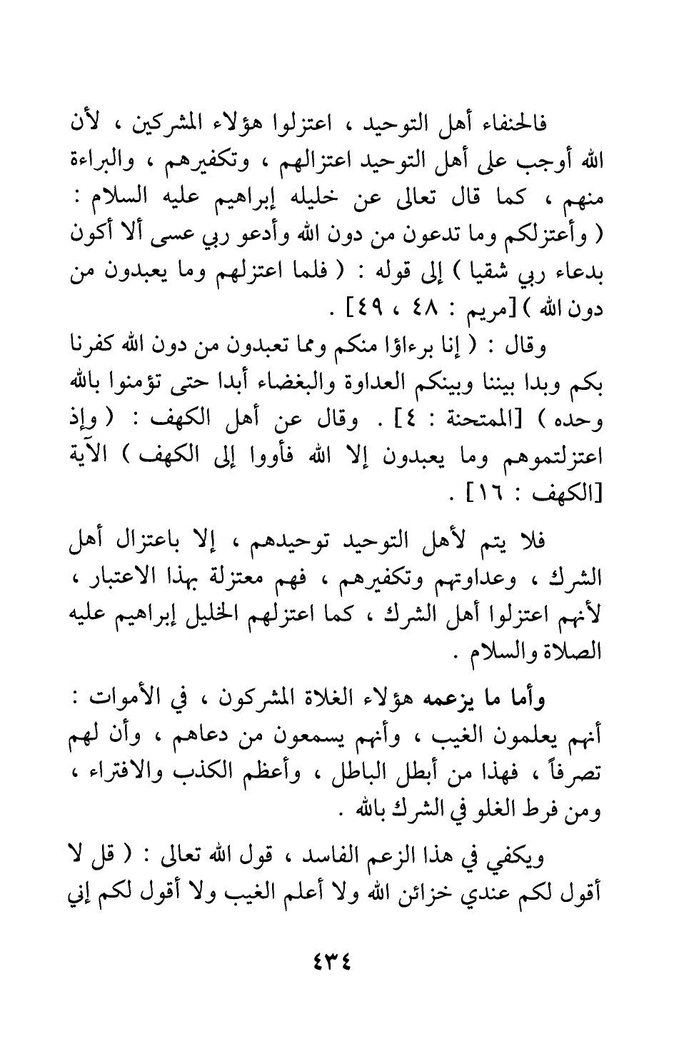 فلا يتم لأهل التوحيد توحيدهم، إلا باعتزال أهل الشرك، وعداوتهم وتكفيرهم؛ فهم معتزلة بهذا الاعتبار؛ لأنهم اعتزلوا أهل الشرك، كما اعتزلهم الخليل إبراهيم عليه الصلاة والسلام.