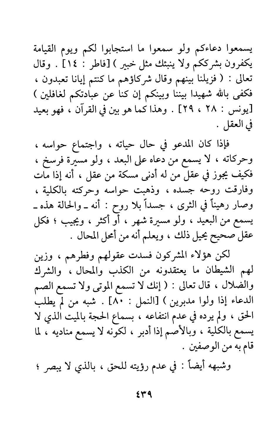 فإذا كان المدعو في حال حياته، واجتماع حواسه وحركاته، لا يسمع من دعاه على البعد، ولو مسيرة فرسخ، فكيف يجوز في عقل من له أدنى مسكة من عقل، أنه إذا مات وفارقت روحه جسده، وذهبت حواسه وحركته بالكلية، وصار رهينا في الثرى، جسدا بلا روح أنه- والحالة هذه- يسمع من البعيد، ولو مسيرة شهر، أو أكثر، ويجيب؟ فكل عقل صحيح يحيل ذلك، ويعلم أنه من أمحل المحال.