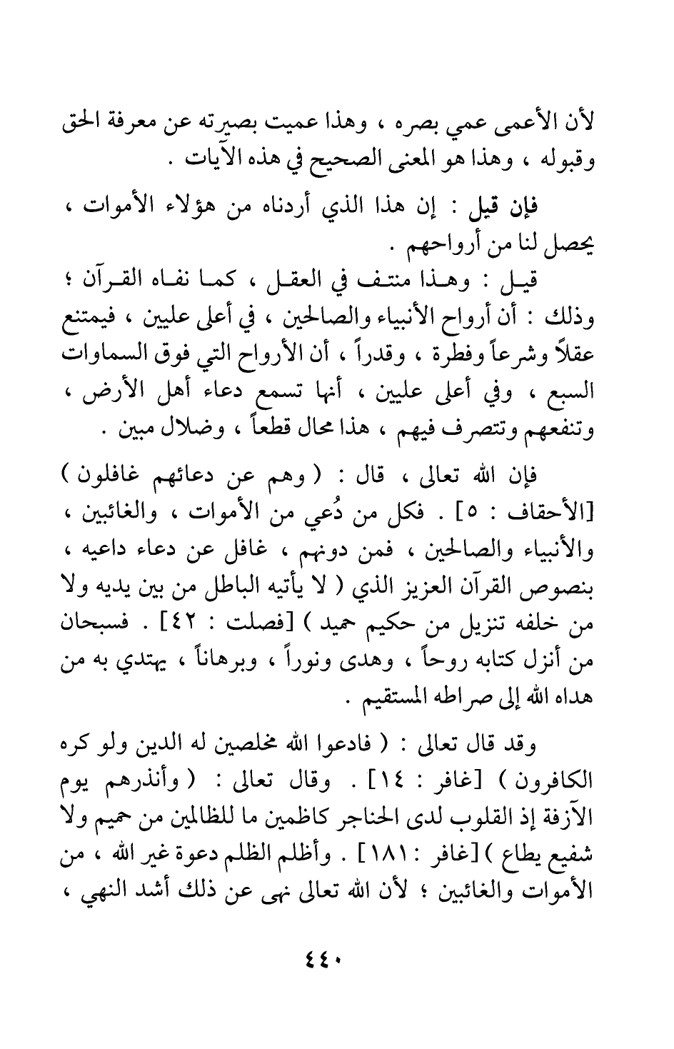 فإن الله تعالى، قال: {وَهُمْ عَنْ دُعَائِهِمْ غَافِلُونَ} [سورة الأحقاف آية: 5] ؛ فكل من دعي من الأموات، والغائبين، والأنبياء والصالحين، فمن دونهم، غافل عن دعاء داعيه، بنصوص القرآن العزيز الذي {لا يَأْتِيهِ الْبَاطِلُ مِنْ بَيْنِ يَدَيْهِ وَلا مِنْ خَلْفِهِ تَنْزِيلٌ مِنْ حَكِيمٍ حَمِيدٍ} [سورة فصلت آية: 42] . فسبحان من أنزل كتابه روحا، وهدى ونورا، وبرهانا، يهتدي به من هداه الله إلى صراطه المستقيم.