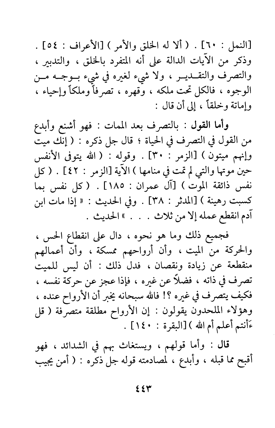 وأما القول بالتصرف بعد الممات، فهو أشنع وأبدع من القول في التصرف في الحياة; قال جل ذكره: {إِنَّكَ مَيِّتٌ وَإِنَّهُمْ مَيِّتُونَ} [سورة الزمر آية: 30] ، وقوله: {اللَّهُ يَتَوَفَّى الْأَنْفُسَ حِينَ مَوْتِهَا وَالَّتِي لَمْ تَمُتْ فِي مَنَامِهَا} [سورة الزمر آية: 42] الآية، {كُلُّ نَفْسٍ ذَائِقَةُ الْمَوْتِ} [سورة آل عمران آية: 185] ، {كُلُّ نَفْسٍ بِمَا كَسَبَتْ رَهِينَةٌ} [سورة المدثر آية: 38] ، وفي الحديث: " إذا مات ابن آدم انقطع عمله إلا من ثلاث " 1 الحديث.