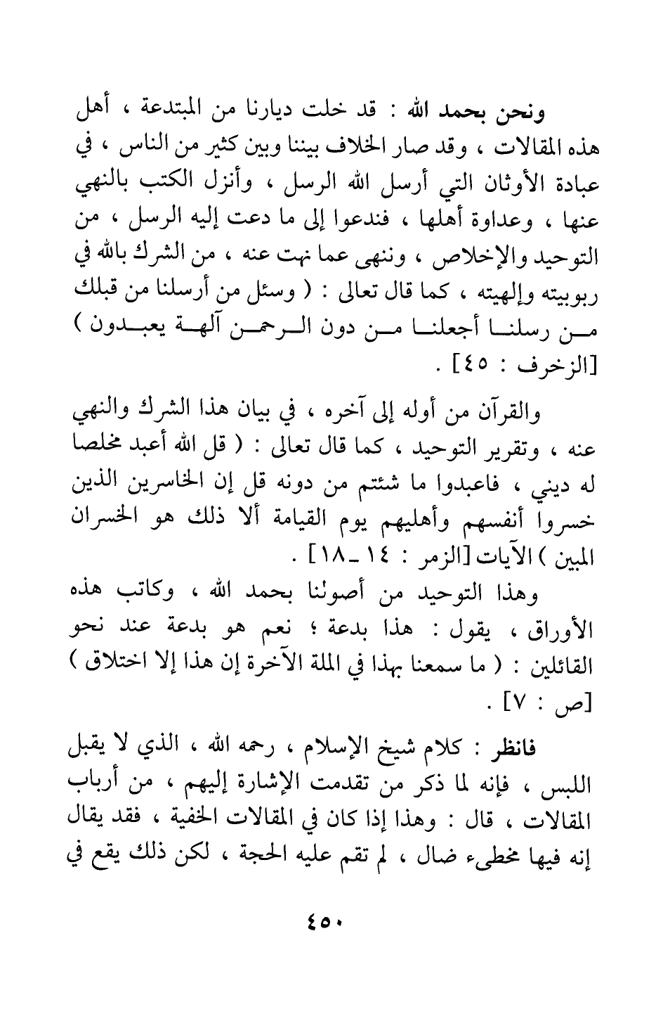 ونحن بحمد الله قد خلت ديارنا من المبتدعة، أهل هذه المقالات، وقد صار الخلاف بيننا وبين كثير من الناس، في عبادة الأوثان التي أرسل الله الرسل، وأنزل الكتب بالنهي عنها، وعداوة أهلها؛ فندعو إلى ما دعت إليه الرسل من التوحيد والإخلاص، وننهى عما نهت عنه من الشرك بالله في ربوبيته وإلهيته، كما قال تعالى: {وَاسْأَلْ مَنْ أَرْسَلْنَا مِنْ قَبْلِكَ مِنْ رُسُلِنَا أَجَعَلْنَا مِنْ دُونِ الرَّحْمَنِ آلِهَةً يُعْبَدُونَ} [سورة الزخرف آية: 45] .