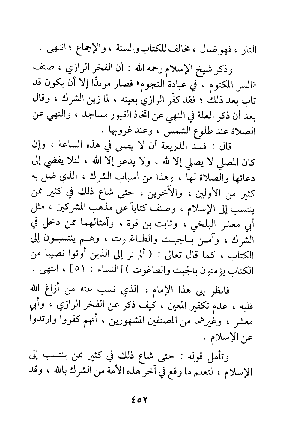 وذكر شيخ الإسلام رحمه الله: أن الفخر الرازي صنف "السر المكتوم، في عبادة النجوم" فصار مرتدا إلا أن يكون قد تاب بعد ذلك; فقد كفر الرازي بعينه، لما زين الشرك، وقال بعد أن ذكر العلة في النهي عن اتخاذ القبور مساجد، والنهي عن الصلاة عند طلوع الشمس، وعند غروبها،