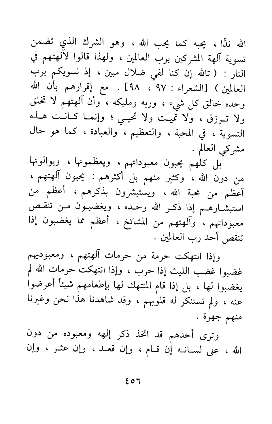 بل كلهم يحبون معبوداتهم، ويعظمونها، ويوالونها من دون الله، وكثير منهم بل أكثرهم يحبون آلهتهم، أعظم من محبة الله، ويستبشرون بذكرهم، أعظم من استبشارهم إذا ذكر الله وحده، ويغضبون من تنقص معبوداتهم، وآلهتهم من المشائخ، أعظم مما يغضبون إذا تنقص أحد رب العالمين.
