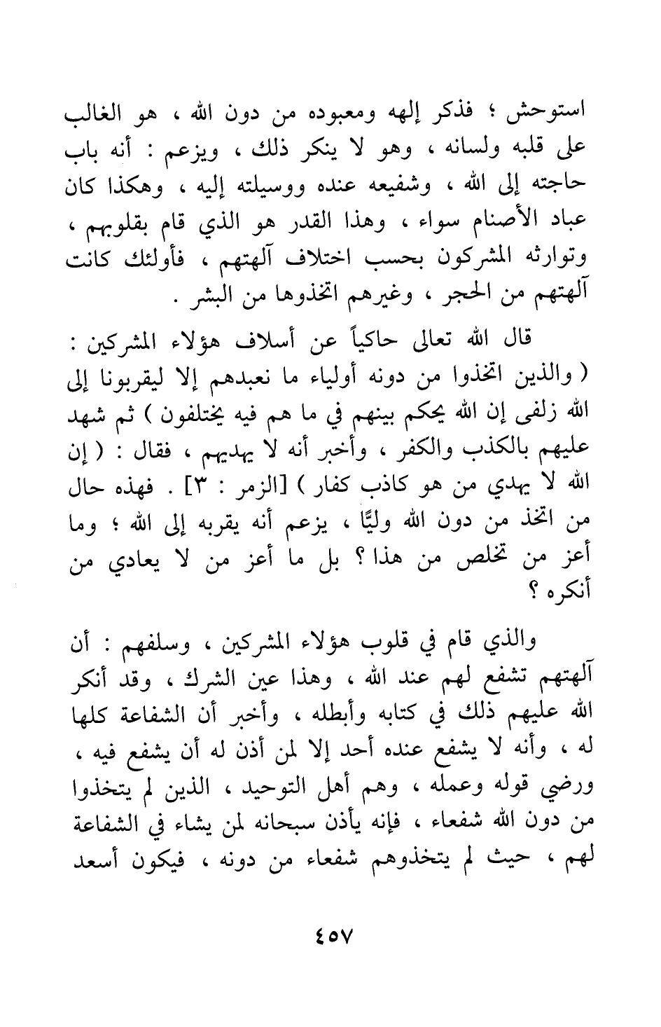 والذي قام في قلوب هؤلاء المشركين، وسلفهم: أن آلهتهم تشفع لهم عند الله، وهذا عين الشرك؛ وقد أنكر الله عليهم ذلك في كتابه وأبطله، وأخبر أن الشفاعة كلها له، وأنه لا يشفع عنده أحد إلا لمن أذن له أن يشفع فيه، ورضي قوله وعمله؛ وهم أهل التوحيد، الذين لم يتخذوا من دون الله شفعاء؛ فإنه يأذن سبحانه لمن يشاء في الشفاعة لهم، حيث لم يتخذوهم شفعاء من دونه، فيكون أسعد