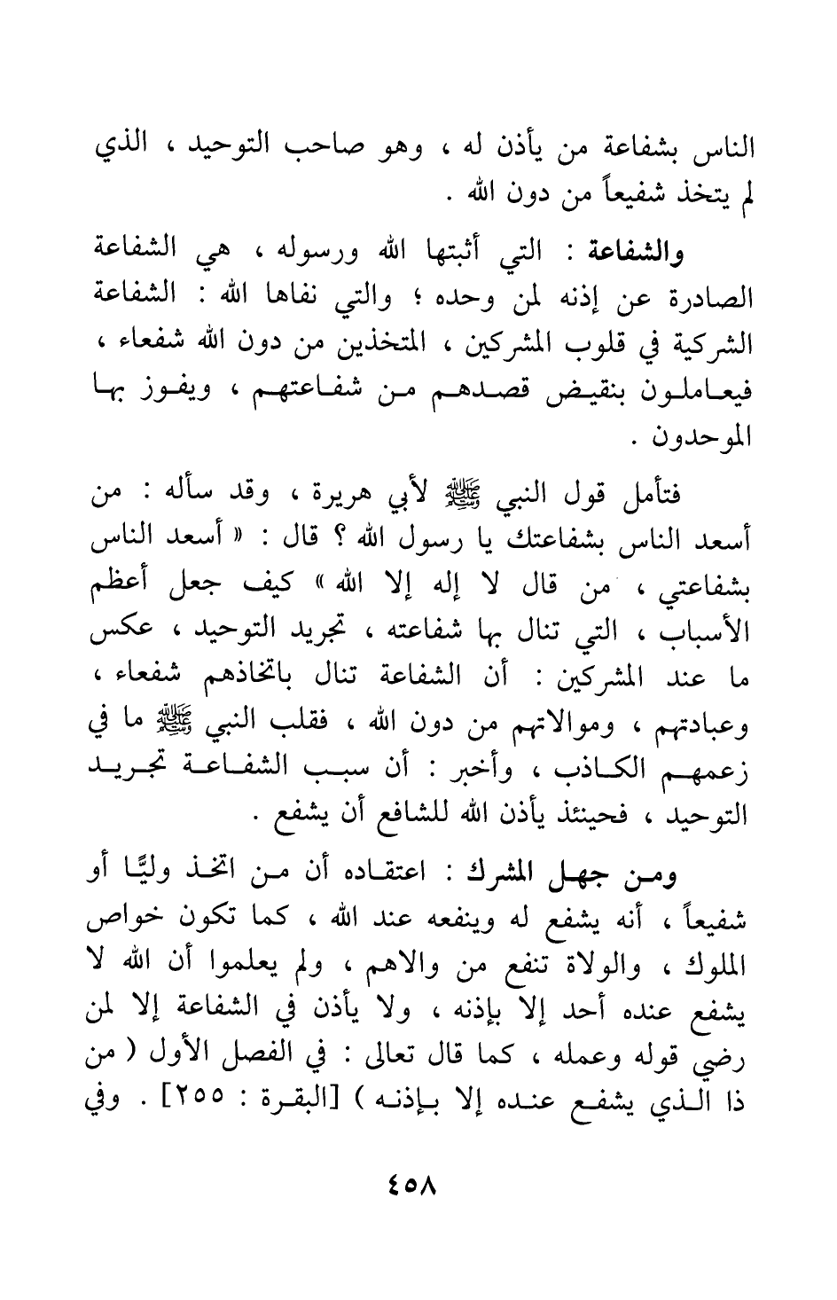 فتأمل قول النبي صلى الله عليه وسلم لأبي هريرة، وقد سأله: من أسعد الناس بشفاعتك يا رسول الله؟ قال: " أسعد الناس بشفاعتي، من قال: لا إله إلا الله "، كيف جعل أعظم الأسباب التي تنال بها شفاعته، تجريد التوحيد، عكس ما عند المشركين: أن الشفاعة تنال باتخاذهم شفعاء، وعبادتهم، وموالاتهم من دون الله؛ فقلب النبي صلى الله عليه وسلم ما في زعمهم الكاذب، وأخبر أن سبب الشفاعة تجريد التوحيد، فحينئذ يأذن الله للشافع أن يشفع.