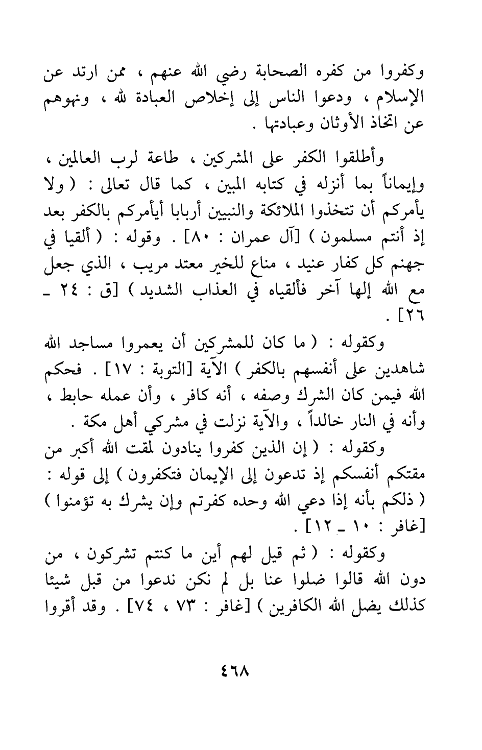 وكفروا من كفره الصحابة رضي الله عنهم، ممن ارتد عن الإسلام، ودعوا الناس إلى إخلاص العبادة لله، ونهوهم عن اتخاذ الأوثان وعبادتها، وأطلقوا الكفر على المشركين، طاعة لرب العالمين، وإيمانا بما أنزله في كتابه المبين، كما قال تعالى: {وَلا يَأْمُرَكُمْ أَنْ تَتَّخِذُوا الْمَلائِكَةَ وَالنَّبِيِّينَ أَرْبَاباً أَيَأْمُرُكُمْ بِالْكُفْرِ بَعْدَ إِذْ أَنْتُمْ مُسْلِمُونَ} [سورة آل عمران آية: 80] ، وقوله: {أَلْقِيَا فِي جَهَنَّمَ كُلَّ كَفَّارٍ عَنِيدٍمَنَّاعٍ لِلْخَيْرِ مُعْتَدٍ مُرِيبٍ الَّذِي جَعَلَ مَعَ اللَّهِ إِلَهاً آخَرَ فَأَلْقِيَاهُ فِي الْعَذَابِ الشَّدِيدِ} [سورة ق آية: 42-26] ،