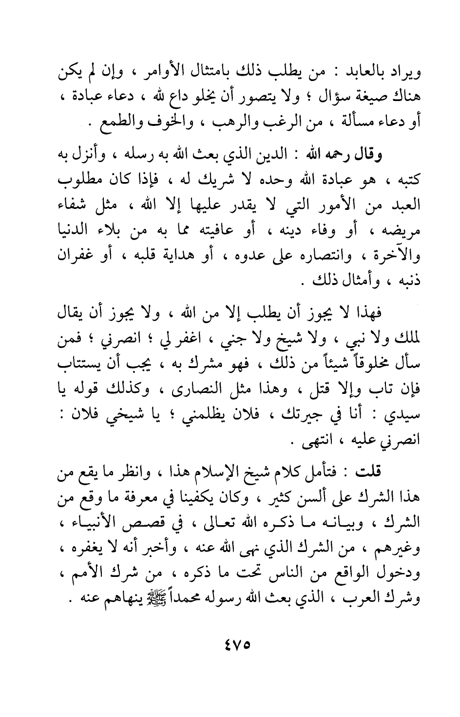 وقال رحمه الله: الدين الذي بعث الله به رسله وأنزل به كتبه هو عبادة الله وحده لا شريك له. فإذا كان مطلوب العبد من الأمور التي لا يقدر عليها إلا الله، مثل شفاء مريضه، أو وفاء دينه، أو عافيته مما به من بلاء الدنيا والآخرة، وانتصاره على عدوه، أو هداية قلبه، أو غفران ذنبه، وأمثال ذلك.