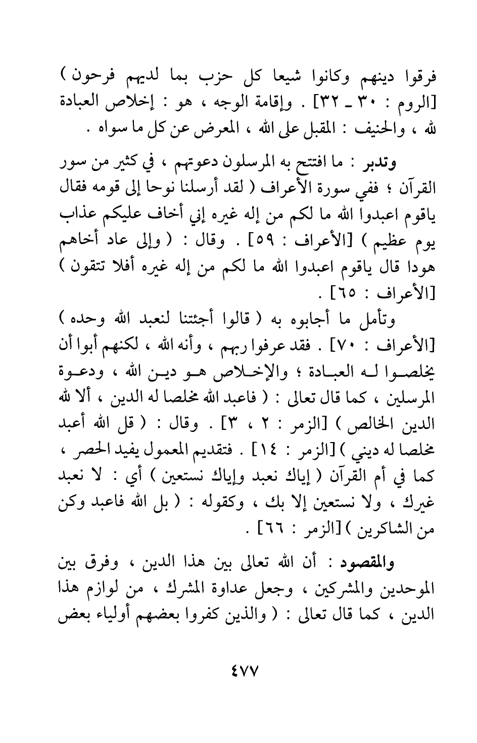فَرَّقُوا دِينَهُمْ وَكَانُوا شِيَعاً كُلُّ حِزْبٍ بِمَا لَدَيْهِمْ فَرِحُونَ} [سورة الروم آية: 31-32] ، وإقامة الوجه، هو: إخلاص العبادة لله، والحنيف: المقبل على الله، المعرض عن كل ما سواه.