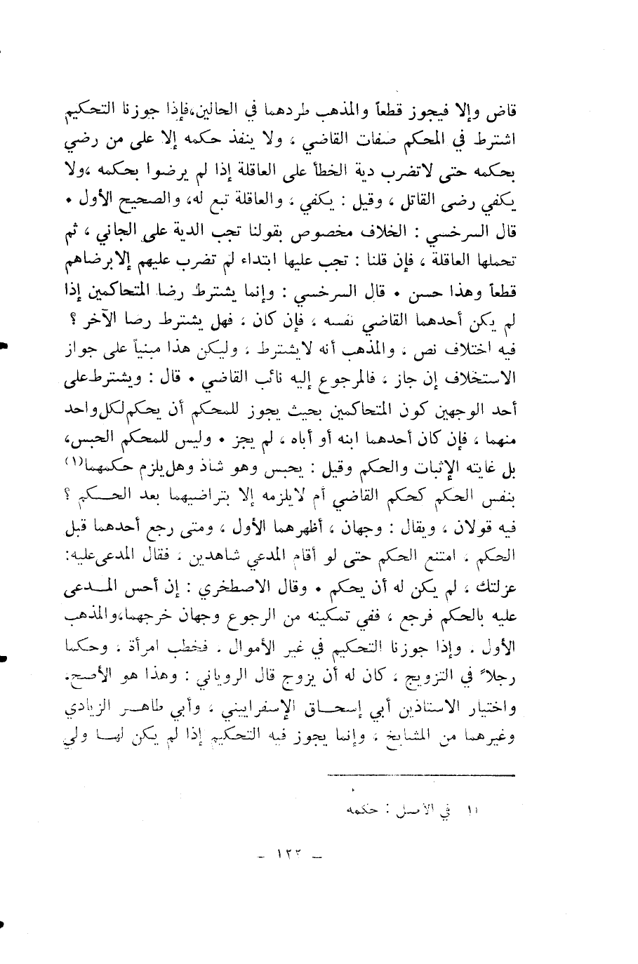 قَاضٍ وَإِلَّا فَيَجُوزُ قَطْعًا وَالْمَذْهَبُ طَرْدُهُمَا فِي الْحَالَيْنِ، فَإِذَا جَوَّزْنَا التَّحْكِيمَ اشْتُرِطَ فِي الْمُحَكِّمِ صِفَاتُ الْقَاضِي، وَلَا يُنَفَّذُ حُكْمُهُ إِلَّا عَلَى مَنْ رَضِيَ بِحُكْمِهِ حَتَّى لَا تُضْرَبَ دِيَةُ الْخَطَأِ عَلَى الْعَاقِلَةِ إِذَا لَمْ يَرْضَوْا بِحُكْمِهِ، وَلَا يَكْفِيَ رِضَى الْقَاتِلِ، وَقِيلَ: يَكْفِي، وَالْعَاقِلَةُ تَبَعٌ لَهُ، وَالصَّحِيحُ الْأَوَّلُ.