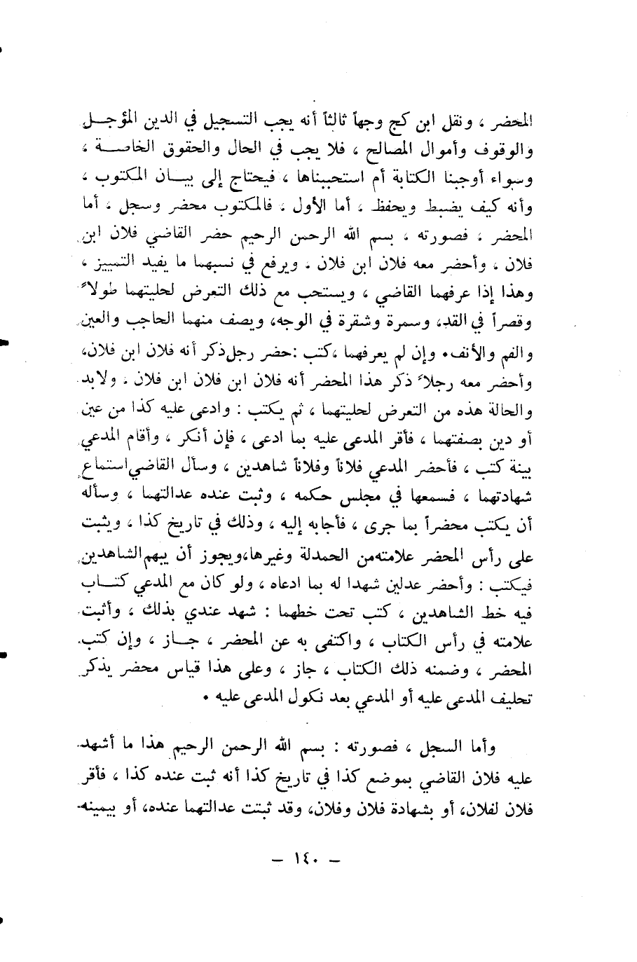 الْمَحْضَرِ، وَنَقَلَ ابْنُ كَجٍّ وَجْهًا ثَالِثًا أَنَّهُ يَجِبُ التَّسْجِيلُ فِي الدَّيْنِ الْمُؤَجَّلِ وَالْوُقُوفِ وَأَمْوَالِ الْمَصَالِحِ. فَلَا يَجِبُ فِي الْحَالِّ وَالْحُقُوقِ الْخَاصَّةِ، وَسَوَاءٌ أَوْجَبْنَا الْكِتَابَةَ أَمِ اسْتَحْبَبْنَاهَا، فَيَحْتَاجُ إِلَى بَيَانِ الْمَكْتُوبِ، وَأَنَّهُ كَيْفَ يُضْبَطُ وَيُحْفَظُ، أَمَّا الْأَوَّلُ، فَالْمَكْتُوبُ مَحْضَرٌ وَسِجِلٌّ، أَمَّا الْمَحْضَرُ، فَصُورَتُهُ: بِسْمِ اللَّهِ الرَّحْمَنِ الرَّحِيمِ، حَضَرَ الْقَاضِي فُلَانُ ابْنُ فُلَانٍ، وَأَحْضَرَ مَعَهُ فُلَانَ ابْنَ فُلَانٍ، وَيَرْفَعُ فِي نَسَبِهِمَا مَا يُفِيدُ التَّمْيِيزَ، وَهَذَا إِذَا عَرَفَهُمَا الْقَاضِي. وَيُسْتَحَبُّ مَعَ ذَلِكَ التَّعَرُّضُ لِحِلْيَتِهِمَا طُولًا وَقِصَرًا فِي الْقَدِّ، وَسُمْرَةً وَشُقْرَةً فِي الْوَجْهِ، وَيَصِفُ مِنْهُمَا الْحَاجِبَ وَالْعَيْنَ وَالْفَمَ وَالْأَنْفَ.