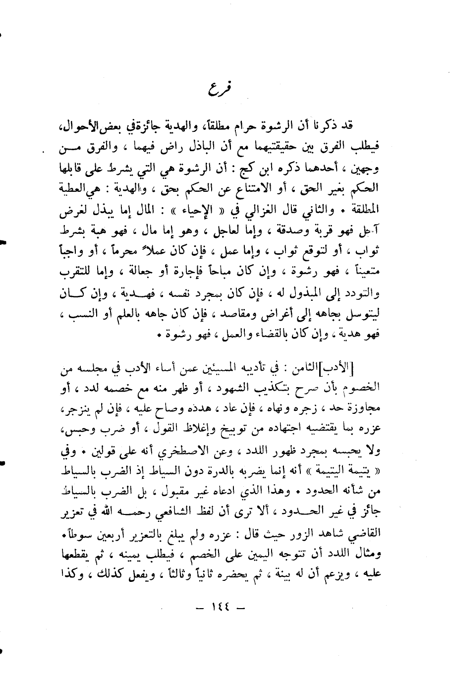 قَدْ ذَكَرْنَا أَنَّ الرِّشْوَةَ حَرَامٌ مُطْلَقًا، وَالْهَدِيَّةُ جَائِزَةٌ فِي بَعْضِ الْأَحْوَالِ، فَيُطْلَبُ الْفَرْقُ بَيْنَ حَقِيقَتَيْهِمَا مَعَ أَنَّ الْبَاذِلَ رَاضٍ فِيهِمَا، وَالْفَرْقُ مِنْ وَجْهَيْنِ، أَحَدُهُمَا ذَكَرَهُ ابْنُ كَجٍّ: أَنَّ الرِّشْوَةَ هِيَ الَّتِي يُشْرَطُ عَلَى قَابِلِهَا الْحُكْمُ بِغَيْرِ الْحَقِّ، أَوْ الِامْتِنَاعُ عَنِ الْحُكْمِ بِحَقٍّ، وَالْهَدِيَّةُ: هِيَ الْعَطِيَّةُ الْمُطْلَقَةُ.