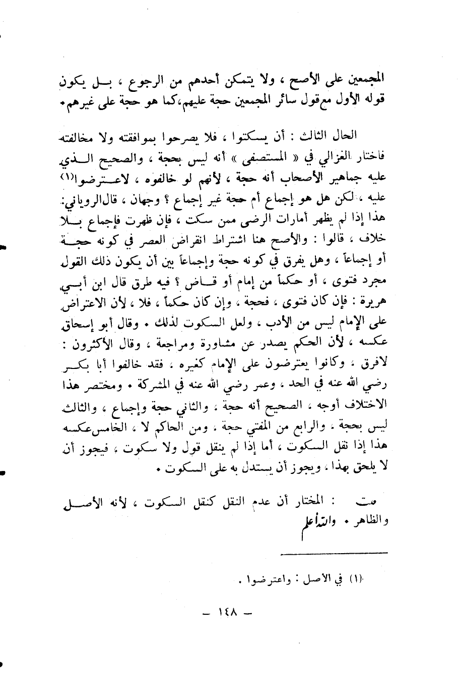 الْحَالُ الثَّالِثُ: أَنْ يَسْكُتُوا، فَلَا يُصَرِّحُوا بِمُوَافَقَتِهِ وَلَا مُخَالَفَتِهِ فَاخْتَارَ الْغَزَالِيُّ فِي «الْمُسْتَصْفَى» أَنَّهُ لَيْسَ بِحُجَّةٍ. وَالصَّحِيحُ الَّذِي عَلَيْهِ جَمَاهِيرُ الْأَصْحَابِ أَنَّهُ حُجَّةٌ، لِأَنَّهُمْ لَوْ خَالَفُوهُ، لَاعْتَرَضُوا عَلَيْهِ، لَكِنْ هَلْ هُوَ إِجْمَاعٌ أَمْ حَجَّةٌ غَيْرُ إِجْمَاعٍ؟ وَجْهَانِ، قَالَ الرُّويَانِيُّ: هَذَا إِذَا لَمْ يَظْهَرْ أَمَارَاتُ الرِّضَى مِمَّنْ سَكَتَ، فَإِنْ ظَهَرَتْ فَإِجْمَاعٌ بِلَا خِلَافٍ، قَالُوا: وَالْأَصَحُّ هُنَا اشْتِرَاطُ انْقِرَاضِ الْعَصْرِ فِي كَوْنِهِ حَجَّةً أَوْ إِجْمَاعًا، وَهَلْ يُفَرَّقُ فِي كَوْنِهِ حُجَّةً وَإِجْمَاعًا بَيْنَ أَنْ يَكُونَ ذَلِكَ الْقَوْلُ مُجَرَّدَ فَتْوًى، أَوْ حُكْمًا مِنْ إِمَامٍ أَوْ قَاضٍ؟ فِيهِ طَرُقٌ قَالَ ابْنُ أَبِي هُرَيْرَةَ: فَإِنْ كَانَ فَتْوًى، فَحُجَّةٌ، وَإِنْ كَانَ حُكْمًا، فَلَا؛ لِأَنَّ الِاعْتِرَاضَ عَلَى الْإِمَامِ لَيْسَ مِنَ الْأَدَبِ، وَلَعَلَّ السُّكُوتَ لِذَلِكَ. وَقَالَ أَبُو إِسْحَاقَ عَكْسَهُ؛ لِأَنَّ الْحُكْمَ يَصْدُرُ عَنْ مُشَاوَرَةٍ وَمُرَاجَعَةٍ، وَقَالَ الْأَكْثَرُونَ: لَا فَرْقَ، وَكَانُوا يَعْتَرِضُونَ عَلَى الْإِمَامِ كَغَيْرِهِ، فَقَدْ خَالَفُوا أَبَا بَكْرٍ - رَضِيَ اللَّهُ عَنْهُ - فِي الْحَدِّ، وَعُمْرَ - رَضِيَ اللَّهُ عَنْهُ - فِي الْمُشْرِكَةِ.