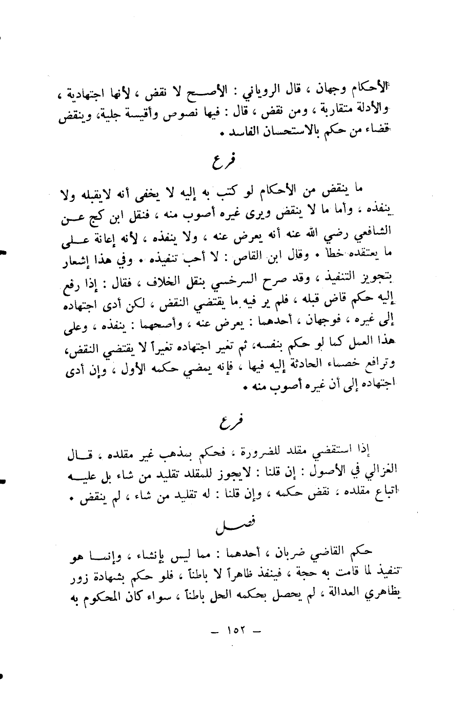 وَقَالَ ابْنُ الْقَاصِّ: لَا أُحِبُّ تَنْفِيذَهُ. وَفِي هَذَا إِشْعَارٌ بِتَجْوِيزِ التَّنْفِيذِ، وَقَدْ صَرَّحَ السَّرَخْسِيُّ بِنَقْلِ الْخِلَافِ، فَقَالَ: إِذَا رُفِعَ إِلَيْهِ حُكْمُ قَاضٍ قَبْلَهُ، فَلَمْ يَرَ فِيهِ مَا يَقْتَضِي النَّقْضَ، لَكِنْ أَدَّى اجْتِهَادُهُ إِلَى غَيْرِهِ، فَوَجْهَانِ، أَحَدُهُمَا: يُعْرِضُ عَنْهُ، وَأَصَحُّهُمَا: يُنَفِّذُهُ، وَعَلَى هَذَا الْعَمَلُ كَمَا لَوْ حَكَمَ بِنَفْسِهِ، ثُمَّ تَغَيَّرَ اجْتِهَادُهُ تَغَيُّرًا لَا يَقْتَضِي النَّقْضَ، وَتَرَافَعَ خُصَمَاءُ الْحَادِثَةِ إِلَيْهِ فِيهَا، فَإِنَّهُ يُمْضِي حُكْمَهُ الْأَوَّلَ، وَإِنْ أَدَّى اجْتِهَادُهُ إِلَى أَنَّ غَيْرَهُ أَصْوَبُ مِنْهُ.
