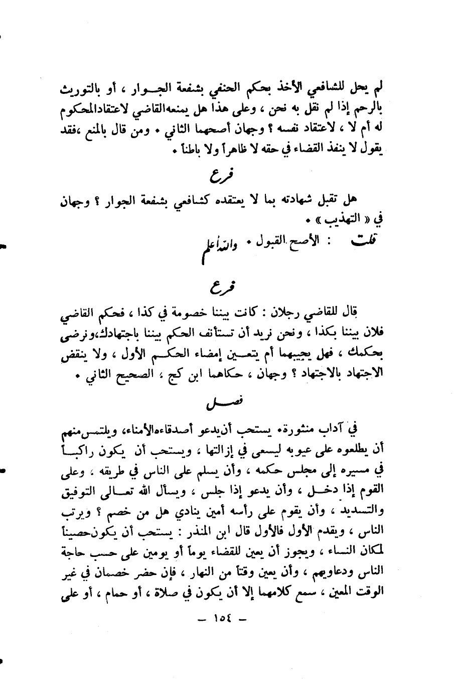 فِي آدَابٍ مَنْثُورَةٍ. يُسْتَحَبُّ أَنْ يَدْعُوَ أَصْدِقَاءَهُ الْأُمَنَاءَ، وَيَلْتَمِسَ مِنْهُمْ أَنْ يُطْلِعُوهُ عَلَى عُيُوبِهِ لِيَسْعَى فِي إِزَالَتِهَا، وَيُسْتَحَبُّ أَنْ يَكُونَ رَاكِبًا فِي مَسِيرِهِ إِلَى مَجْلِسِ حُكْمِهِ، وَأَنْ يُسَلِّمَ عَلَى النَّاسِ فِي طَرِيقِهِ، وَعَلَى الْقَوْمِ إِذَا دَخَلَ، وَأَنْ يَدْعُوَ إِذَا جَلَسَ، وَيَسْأَلَ اللَّهَ تَعَالَى التَّوْفِيقَ وَالتَّسْدِيدَ، وَأَنْ يَقُومَ عَلَى رَأْسِهِ أَمِينٌ يُنَادِي هَلْ مِنْ خَصْمٍ؟ وَيُرَتِّبُ النَّاسَ، وَيُقَدِّمُ الْأَوَّلَ فَالْأَوَّلَ. قَالَ ابْنُ الْمُنْذِرِ: يُسْتَحَبُّ أَنْ يَكُونَ حَصِينًا لِمَكَانِ النِّسَاءِ، وَيَجُوزُ أَنْ يُعَيِّنَ لِلْقَضَاءِ يَوْمًا أَوْ يَوْمَيْنِ عَلَى حَسَبِ حَاجَةِ النَّاسِ وَدَعَاوِيهِمْ، وَأَنْ يُعَيِّنَ وَقْتًا مِنَ النَّهَارِ، فَإِنْ حَضَرَ خَصْمَانِ فِي غَيْرِ الْوَقْتِ الْمُعَيَّنِ، سَمِعَ كَلَامَهُمَا إِلَّا أَنْ يَكُونَ فِي صَلَاةٍ أَوْ حَمَّامٍ أَوْ عَلَى