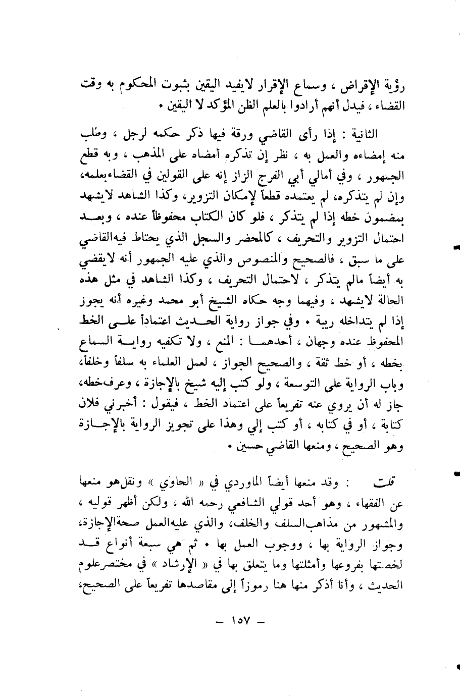 رُؤْيَةَ الْإِقْرَاضِ، وَسَمَاعَ الْإِقْرَارِ لَا يُفِيدُ الْيَقِينَ بِثُبُوتِ الْمَحْكُومِ بِهِ وَقْتَ الْقَضَاءِ، فَيَدُلُّ أَنَّهُمْ أَرَادُوا بِالْعِلْمِ الظَّنَّ الْمُؤَكَّدَ لَا الْيَقِينَ. الثَّانِيَةُ: إِذَا رَأَى الْقَاضِي وَرَقَةً فِيهَا ذِكْرُ حُكْمِهِ لِرَجُلٍ، وَطَلَبَ مِنْهُ إِمْضَاءَهُ وَالْعَمَلَ بِهِ، نُظِرَ إِنْ تَذَكَّرَهُ أَمْضَاهُ عَلَى الْمَذْهَبِ، وَبِهِ قَطَعَ الْجُمْهُورُ، وَفِي أَمَالِي أَبِي الْفَرَجِ الرَّزَّازِ إِنَّهُ عَلَى الْقَوْلَيْنِ فِي الْقَضَاءِ بِعِلْمِهِ وَإِنْ لَمْ يَتَذَكَّرْهُ، لَمْ يَعْتَمِدْهُ قَطْعًا لِإِمْكَانِ التَّزْوِيرِ، وَكَذَا الشَّاهِدُ لَا يَشْهَدُ بِمَضْمُونِ خَطِّهِ إِذَا لَمْ يَتَذَكَّرْ، فَلَوْ كَانَ الْكِتَابُ مَحْفُوظًا عِنْدَهُ، وَبَعْدَ احْتِمَالِ التَّزْوِيرِ وَالتَّحْرِيفِ، كَالْمَحْضَرِ وَالسِّجِلِّ الَّذِي يَحْتَاطُ فِيهِ الْقَاضِي عَلَى مَا سَبَقَ، فَالصَّحِيحُ وَالْمَنْصُوصُ وَالَّذِي عَلَيْهِ الْجُمْهُورُ أَنَّهُ لَا يَقْضِي بِهِ أَيْضًا مَا لَمْ يَتَذَكَّرْ، لِاحْتِمَالِ التَّحْرِيفِ، وَكَذَا الشَّاهِدُ فِي مِثْلِ هَذِهِ الْحَالَةِ لَا يَشْهَدُ، وَفِيهِمَا وَجْهٌ حَكَاهُ الشَّيْخُ أَبُو مُحَمَّدٍ وَغَيْرُهُ أَنَّهُ يَجُوزُ إِذَا لَمْ يَتَدَاخَلْهُ رِيبَةٌ.